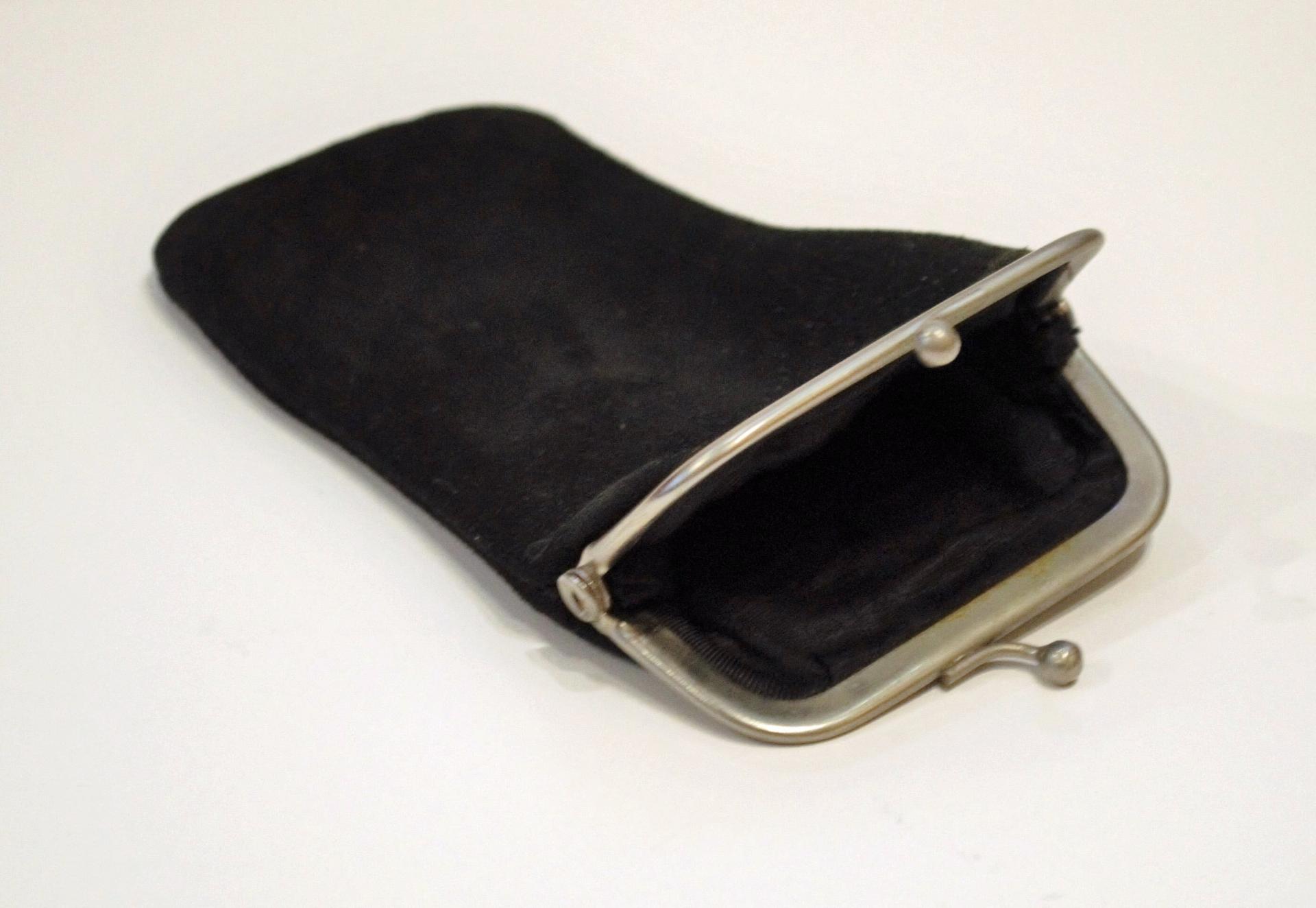 Очечник тканевый. Прямоугольный с прямой металлической рамкой (фермуаром) и замком в виде двух шариков.