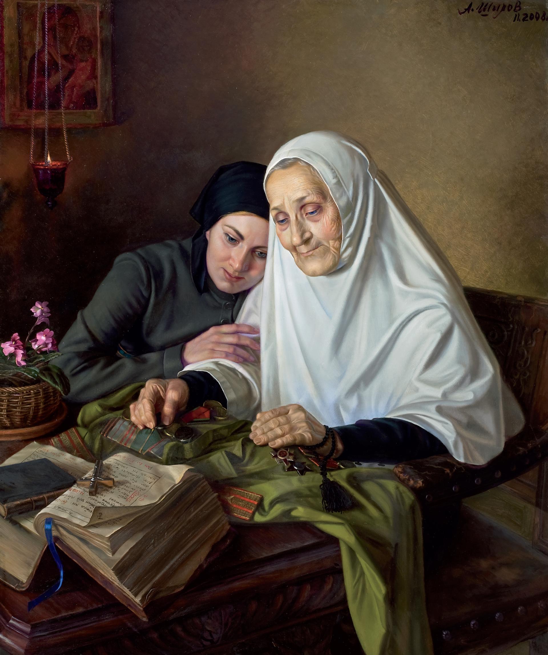 А.Шилов создал немало полотен, в которых раскрывается судьба настоящих героев, не выдуманных, не сделанных прессой, а поистине великих людей, великих своим духом. Эту тему продолжают картина «За Веру и Отечество. Разведчица Великой Отечественной войны Н.В. Малышева» (2008). Перед нами, казалось бы, привычная, на первый взгляд, картина монашеской жизни: пожилая монахиня, к которой с нежностью и любовью прильнула молодая послушница, келья, Священное писание. Но есть один предмет, который выбивается из этого привычного строя, удивляет - военная гимнастерка, пестрящая орденами и медалями. Монахиня касается рукой не столько своих наград, сколько воспоминаний, связанных с ними. Ведь каждая награда - веха ее героической жизни, за каждой своя история. Матушка Адриана - в миру Наталья Владимировна Малышева в 19 лет ушла добровольцем на фронт. Она хорошо знала немецкий язык и становится разведчицей легендарной 16-й армии К. Рокоссовского. Многократные вылазки в тыл врага за сведениями о местоположении, технике, родах войск противника. И так всю войну. После закончила МАИ и 35 лет проработала в НИИ-88, которым руководил С.П.Королев. Была конструктором двигателей для ракет. А в 1993 г. Малышева приняла монашеский постриг и под именем Адрианы стала служить в московском подворье Свято-Успенского Пюхтицкого женского монастыря. Монахиня и разведчица уместились в одном человеке. «Вы спрашиваете, что общего между долей монахини и долей разведчицы? Много общего! Ведь и там, и тут цель одна - о себе забываешь, когда нужно помочь другому» - улыбается матушка Адриана. Благодаря мастерству художника, на полотне искусно переплетается прошлое и настоящее, история и современность. Картину можно сравнить с иконой, настолько светлым и чистым получился образ героини. Среди приглушенного, затемненного фона с особой выразительностью выступает фигура матушки. Белый апостольник выделяет лицо монахини. Кажется, оно светится изнутри, озаряя все вокруг. Всматриваешься в картину и замечаешь, как сам становишься чище сердцем и душой.