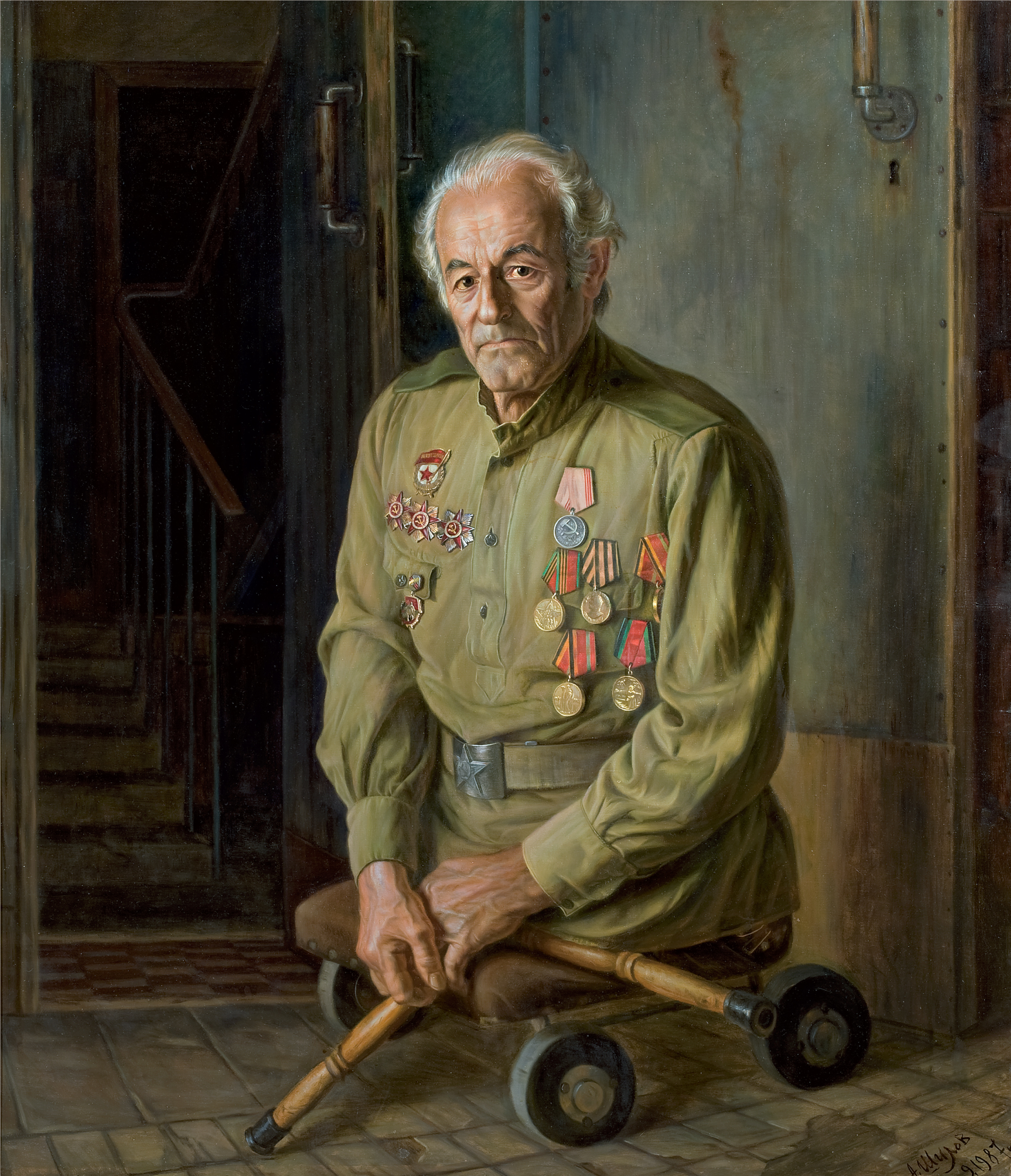 А.Шилов в своем творчестве часто обращается к серьезным и злободневным проблемам современной России, какой бы болью в сердце художника не отзывались эти сюжеты. “Я не пишу какую-то профессию или должность — а воссоздаю внутренний портрет человека, мое сопереживание. Тут нельзя ничего приукрашивать, лакировать. Правда беспощадна, и только такую правду принимает и ценит народ” - говорит художник. Всмотритесь в лицо пулеметчика Шорина с картины “В День Победы” (1987). В нем читаются мужество и сила духа, боль и горечь прожитой жизни. В девятнадцатилетнем возрасте в кровопролитных боях под Псковом пулеметчик П.П.Шорин был тяжело ранен, потерял обе ноги. Ему потребовалось все его мужество, чтобы жить, не уступая жалости к себе, и огромная сила для преодоления самого себя ради жизни, достойной человека. “Он не спился, не пошел по вагонам с протянутой рукой, а поступил на работу, вырастил сына. Разве это не пример человеческого мужества, - говорит А.Шилов. - Именно на таких примерах надо воспитывать юное поколение”. Но образ солдата, преисполненного достоинства, силы духа, выступает ярким контрастом с фоном полотна, где мы видим серые, облупленные стены подъезда. Что получил он за свое мужество, за то, что не пожалел ничего для Родины? Немым ответом на этот вопрос звучат полотна А.Шилова.