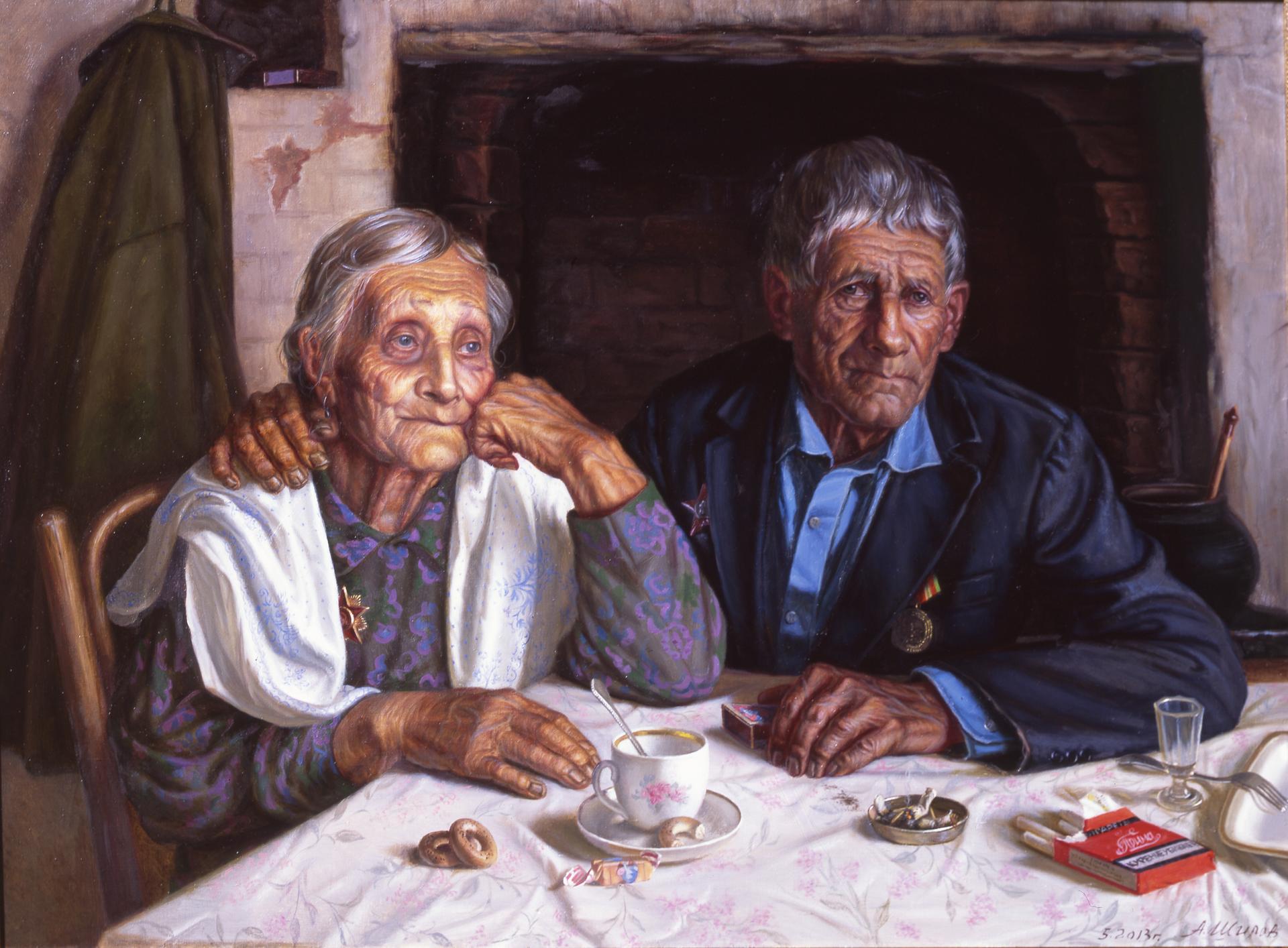 Чрезвычайно выразительна новая работа А.Шилова “Это они защитили Родину!”. Мы словно стали свидетелями тихого семейного вечера. Еще несколько минут назад пожилые люди разговаривали по душам, вспоминая детей, свою нелегкую жизнь, страшные годы войны. Но притихли на минуту, задумались. Может быть, каждый вспомнил о чем-то своем, а может, мысли их блуждают в одном направлении. Вся жизнь прошла перед глазами, непростая, но честная трудовая жизнь. Не искали они, где работа полегче, не стремились к наживе, а трудились не покладая рук. И в годы войны защищали свою Родину и свою землю на передовой, не жалея жизни. В этой жанровой картине художнику удалось воплотить столько чувств, что душа переполняется нежностью и благодарностью к героям. Здесь и красота достойно прожитой жизни, и душевная щедрость, и легкая грусть. Но доминирующим чувством в картине хочется все таки назвать любовь – любовь к друг другу, к людям, к Отечеству. Ведь все испытания, выпавшие на их доли, они прошли вместе, рука об руку. Скромный быт крестьянской избы не отталкивает, а наоборот усиливает впечатление от картины. Чем проще одежда, обстановка, окружающая героев, тем ярче контрастом звучит душевная красота героев. Их добрые лица, бездонные, по-детски чистые глаза вновь и вновь приковывают взгляд зрителя. Каждая морщина прописана художником с поражающей воображение достоверностью. Это война оставила на их лицах свои отметины. Картину можно назвать “эпосом народной жизни”. И такое название вполне справедливо. Ведь в ней звучит гимн несокрушимому русскому духу.