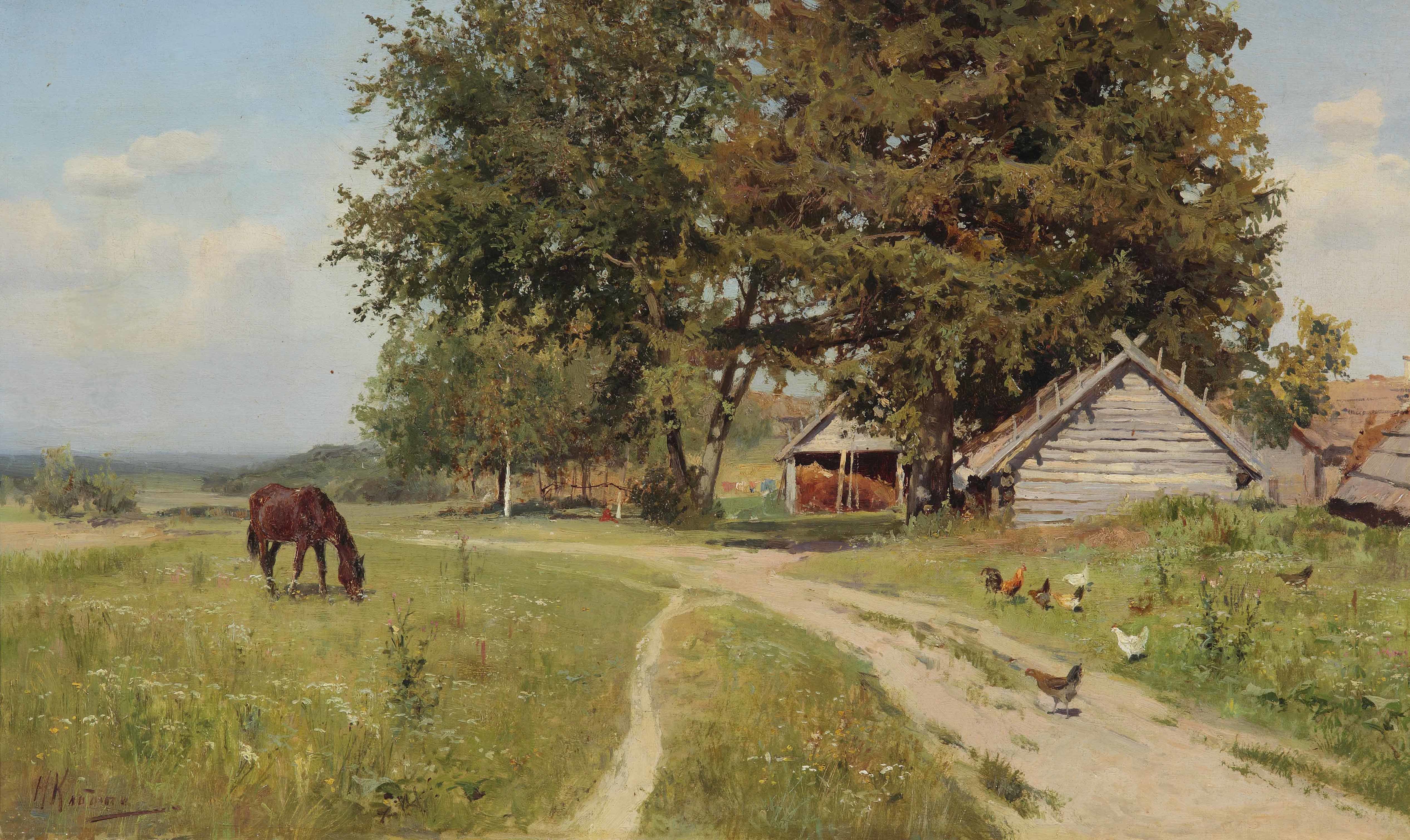 Театральный декоратор и мастер станковой картины, Николай Клодт окончил Московское училище живописи, ваяния и зодчества, в котором впоследствии преподавал. Клодт состоял в Товариществе передвижных выставок и в Союзе русских художников. Его профессиональный выбор предопределила обстановка, сложившаяся в семье, и люди его окружавшие. Дед художника – Пётр Карлович Клодт – автор скульптурной группы «Укротители коней» на Аничковом мосту в Санкт-Петербурге, а двоюродный дядя – Михаил Константинович Клодт – известный художник-передвижник. В «Сельском пейзаже» Николай Клодт точно передаёт характер крестьянской жизни с её неспешным и размеренным ритмом. Он пишет традиционную деревенскую панораму с пасущейся лошадью и квохчущими неподалёку курами. Чуть в стороне стоит бревенчатый домик, рядом навес с уложенными под ним стогами сена – результат нелёгких крестьянских трудов. Типичный среднерусский пейзаж дополняют разлапистые ели и тонкие берёзы.
