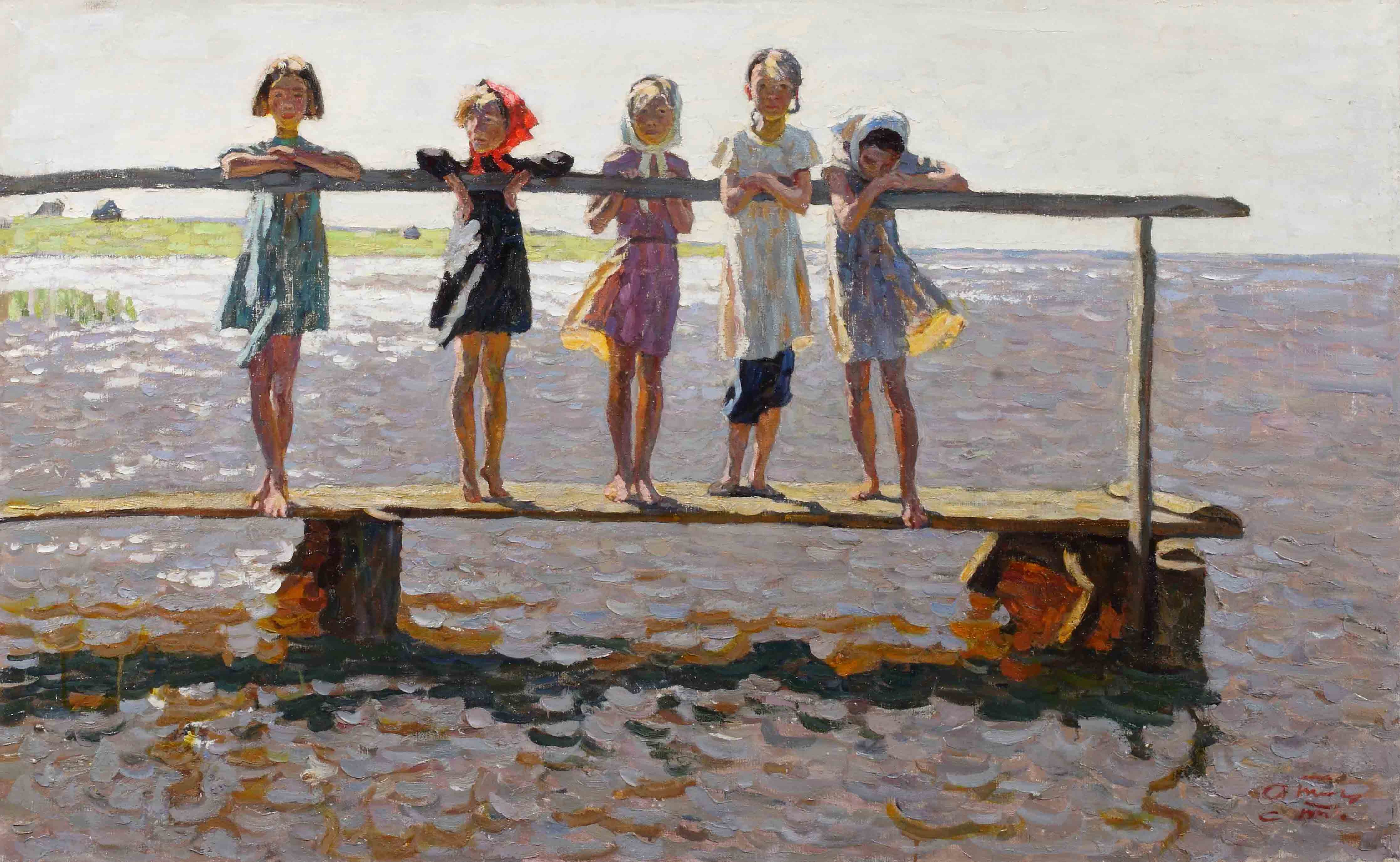 Сергей и Алексей Ткачёвы – редкий по своей силе тандем живописцев. Уроженцы Брянской области, они учились у замечательного художника и педагога Сергея Герасимова в Московском художественном институте имени Василия Сурикова. Основной темой творчества братьев стала сельская жизнь во всех её проявлениях. На освещённом летним солнцем деревянном мостке стоят деревенские девочки. Воду художники пишут фактурными мазками, добиваясь иллюзии живой трепещущей поверхности. Ветер играет с девичьими платьями и косынками, яркое полуденное (тени почти нет) солнце и блики от воды слепят глаза. У каждого ребенка свой характер — бойкий, робкий, веселый или смущённый. «Детвора» Ткачевых — это беззаботное счастье, радость бытия, наслаждение каждым мгновением жизни, с невероятной точностью пойманные и запечатленные художниками.