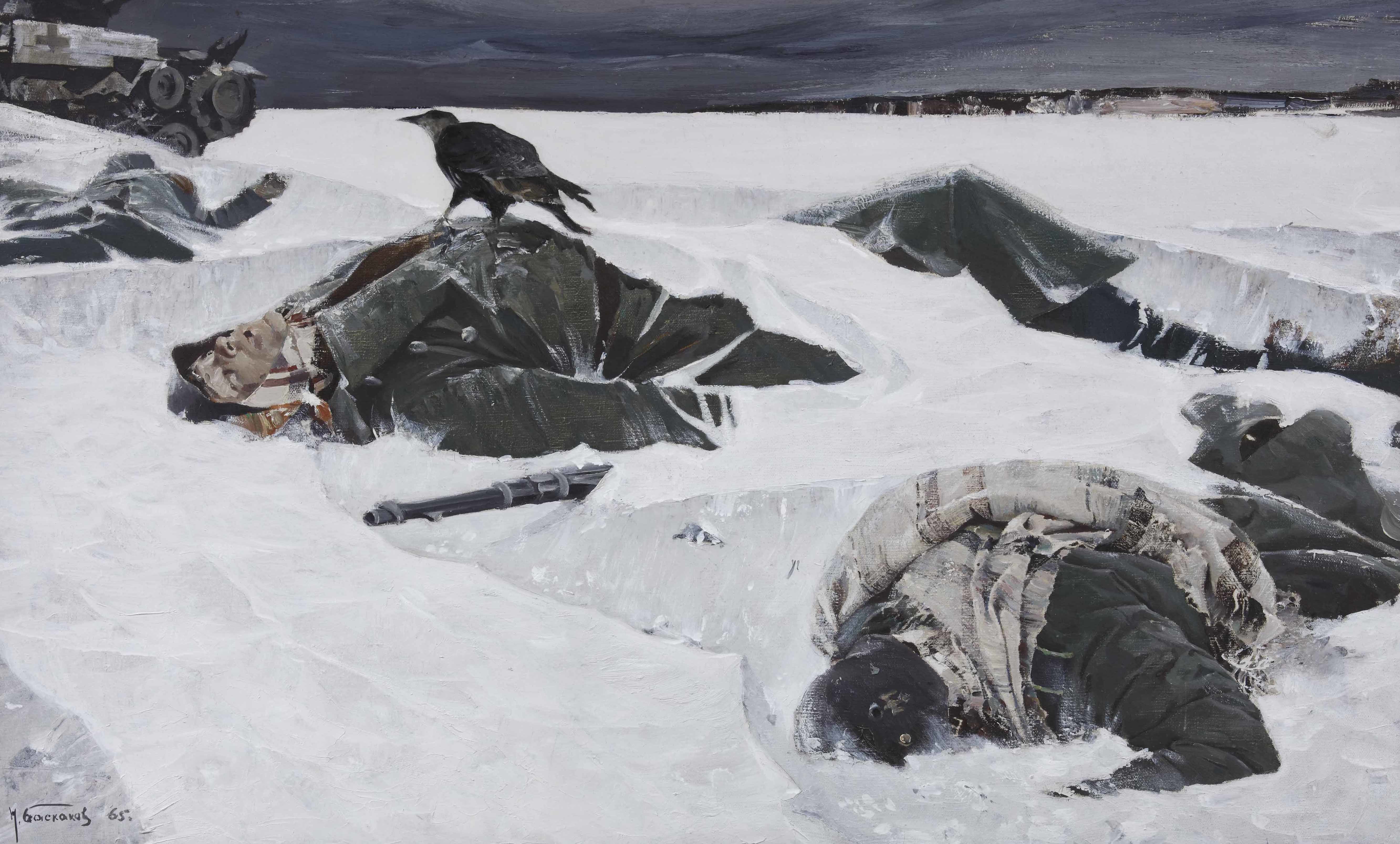 Картина «На русской земле» посвящена событиям Великой Отечественной войны. Сюжет аллегоричен: запорошенное свежим снегом поле со следами недавнего боя — подбитыми танками, брошенным оружием. На переднем плане — убитые немецкие солдаты. Поверх военной формы они укутаны домоткаными половиками, явно позаимствованными из деревенских изб. На одном из тел восседает ворон — извечный символ смерти. Низкое серое небо, пронизывающий холод, бесконечные заснеженные просторы…и бесславная смерть — так встретила Россия захватчиков. В данном случае мы видим классическую метафору слов Александра Невского: «Кто к нам с мечом придет, тот от меча и погибнет».