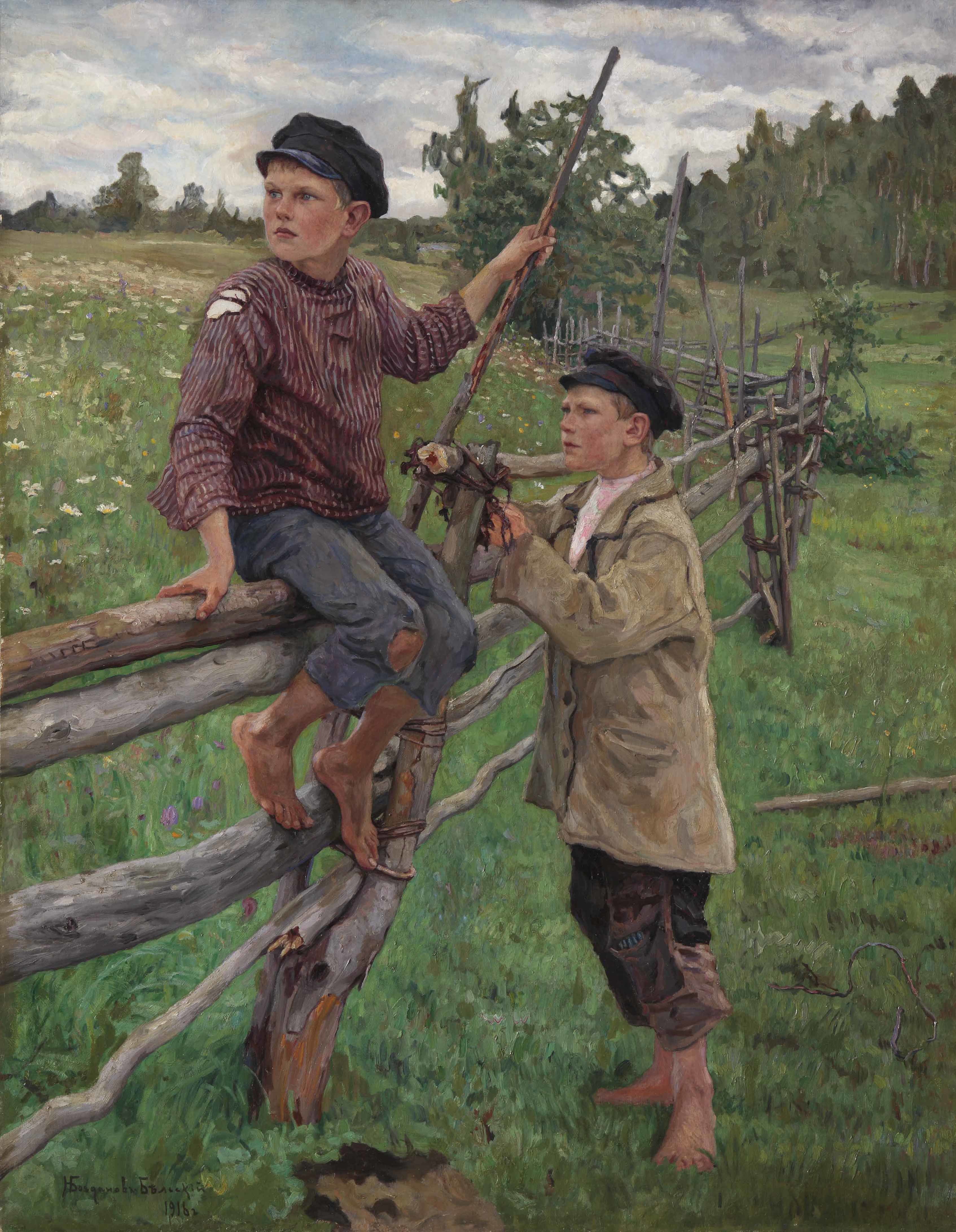 Главные герои картины – двое мальчишек, один из которых сидит на покосившемся, но достаточно крепком, чтобы выдержать его, плетне. На голове у него чёрный картуз – характерный для XIX и начала XX века головной убор, который носили как городские, так и деревенские жители. Одетый в заплатанную рубаху и явно не подходящие по размеру штаны с дырой на коленке, он настороженно повернулся в сторону. Зритель не видит, что именно привлекло его внимание, – художник оставляет это за рамками картины, тем самым расширяя её границы. Рядом тревожно вглядывается вдаль его приятель, такой же босой и в одежде с чужого плеча. В картине отсутствует обличающий социальное неравенство пафос, образы не идеальны, но в то же время поэтичны благодаря лирическому изображению природы – на заднем плане можно увидеть ромашковое поле за плетнём, лес и затянутое облаками небо.