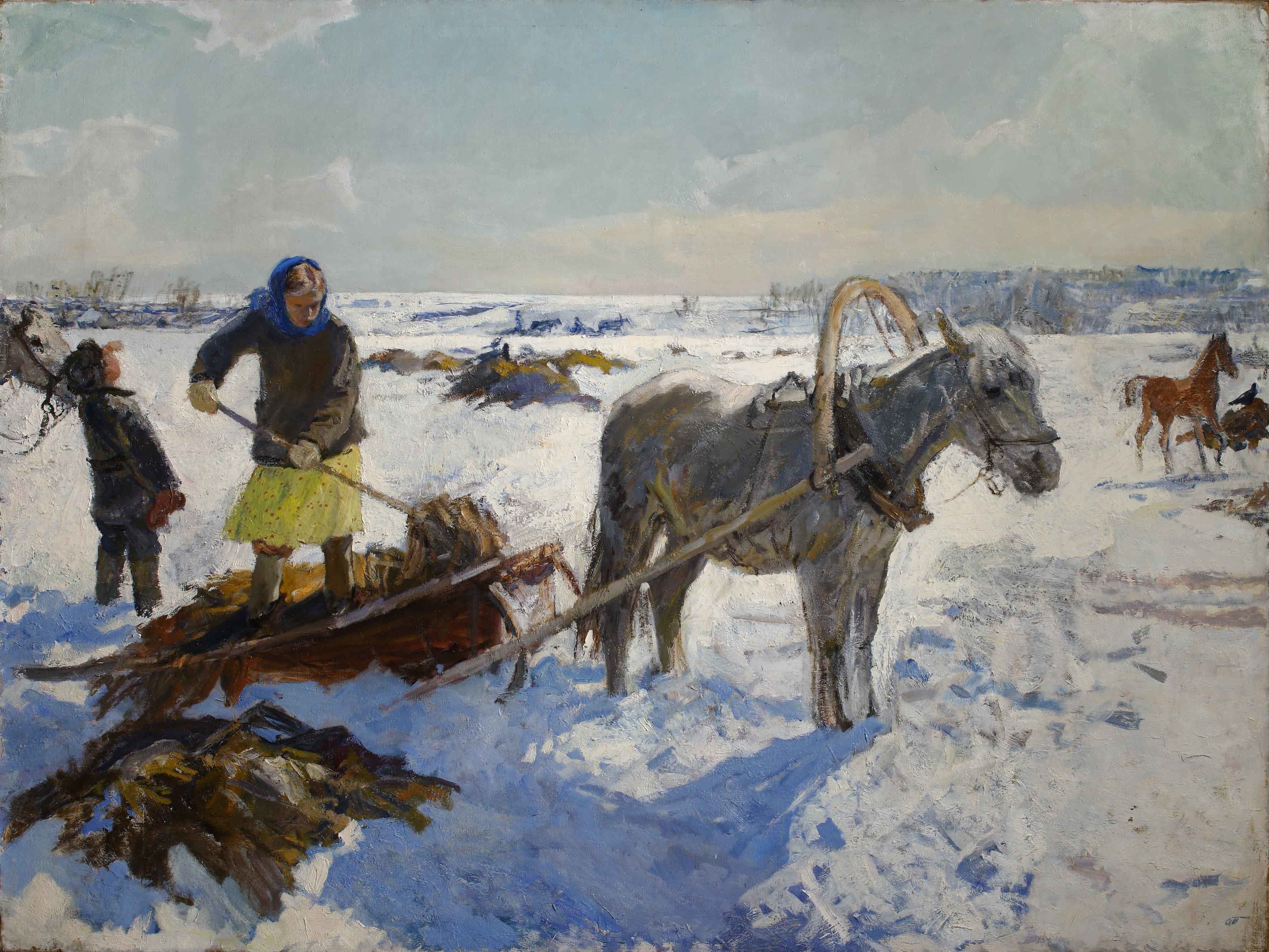 Аркадий Пластов как художник сформировался под влиянием передвижников и мастеров Союза русских художников. Начиная с середины 1930-х годов Пластов обратился к традиции русской пленэрно-жанровой живописи. Его работам свойственна простота композиции, особое внимание к передаче эмоций, деталей природы и яркости красок. Главным источником вдохновения для Пластова стали природа и жители села Прислониха в Ульяновской области, где он и провел большую часть своей жизни. На картине «Деревенский март» сцена из повседневности русской деревни изображена художником с особой любовью. Пластов находит красоту в красках подтаявшего мартовского снега, в его голубых, синих и розовых оттенках. Яркими цветными акцентами становятся фигуры лошади с солнечными бликами на спине, женщины в яркой юбке и мальчика, стоящего рядом.