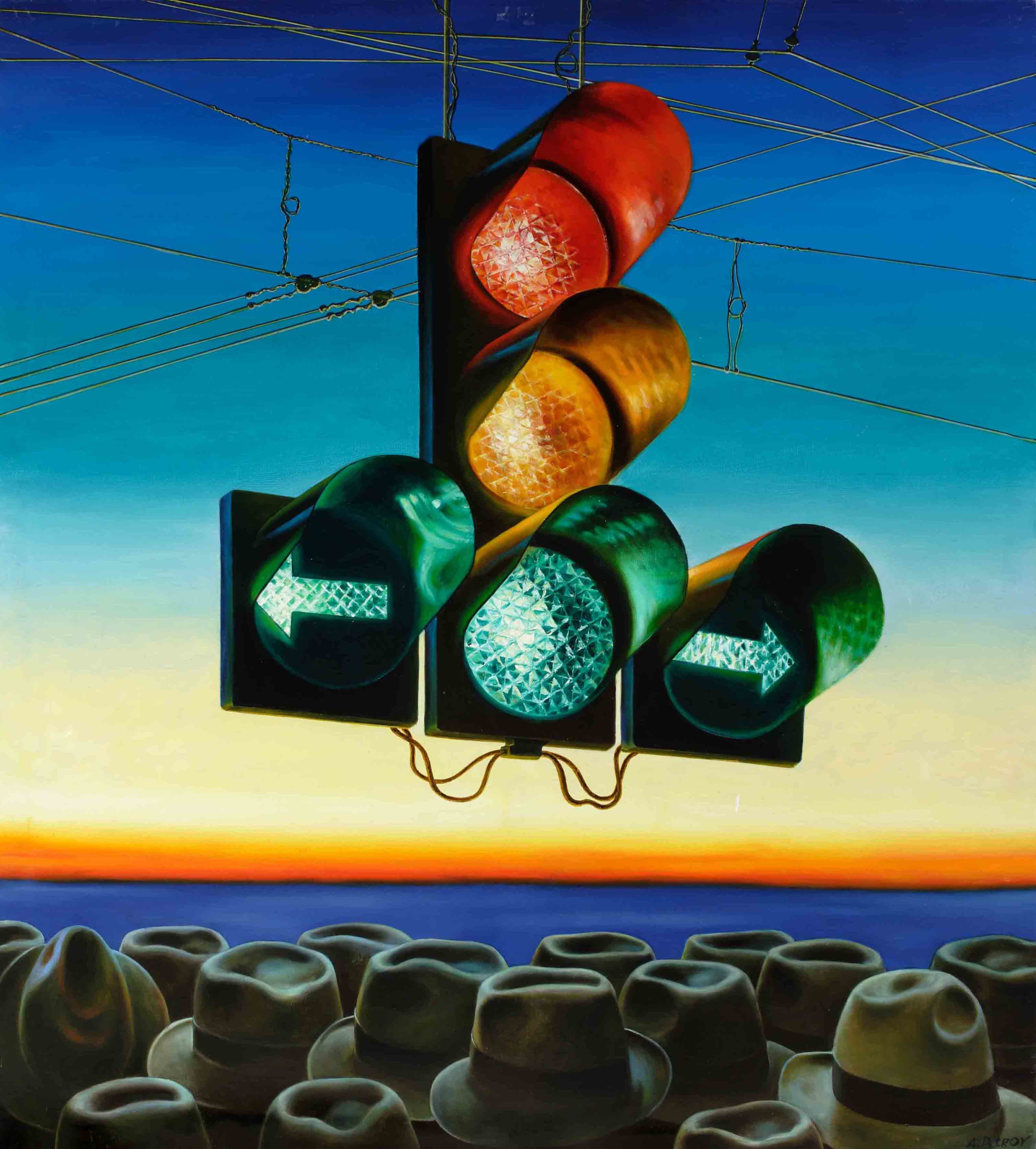 Жизнь современного мегаполиса является одной из любимых тем гиперреалистов. Главные герои их произведений — витрины магазинов и ресторанов, телефонные будки, рекламные баннеры, станции метро и дорожные знаки. Художник Александр Петров изобразил главный элемент городского движения — светофор. Мы не видим пространства улицы и автомобилей. Мы видим только шляпы пешеходов и закатное небо над их головами. Художник не копирует в буквальном смысле реальность, а моделирует гипотетическую ситуацию и с помощью художественных средств доводит её до вещественной осязаемости. Все объекты на картине оказываются равнозначными и выписаны с одинаковой степенью проработанности. Художник будто через увеличительное стекло рассматривает поверхность линз светофора, натянутые электропровода, фетровые шляпы. Головы пешеходов он буквально клонирует, многократно тиражирует, уравнивая героев и стирая индивидуальные черты.