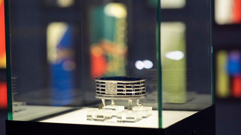 Перед нами парадная солонка из синего стекла на металлическом каркасе. Возможно, она является памятным сувениром, связанным с важным событием в семье наследника русского престола Павла I Петровича и Марии Федоровны. В 1795 г. по случаю рождения цесаревны Анны Павловны был устроен приём, на котором гостям вручались небольшие подарки. О том, что таким подарком могла быть представленная солонка, говорит выгравированная на медальонах дата «1795 году» и вензель «АП», похожий на вензель императора Павла I. Также ножки солонки выполнены в виде лап крупной хищной птицы, в подражание изображению орлиных лап, сжимающих державу на гербе Российской Империи.