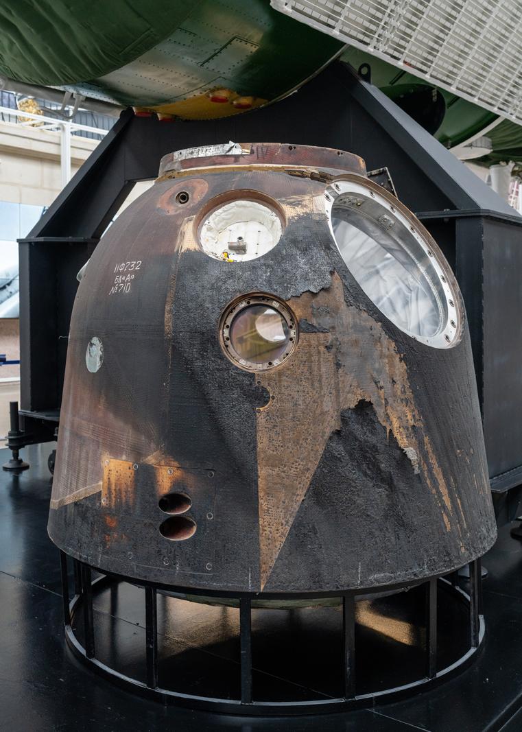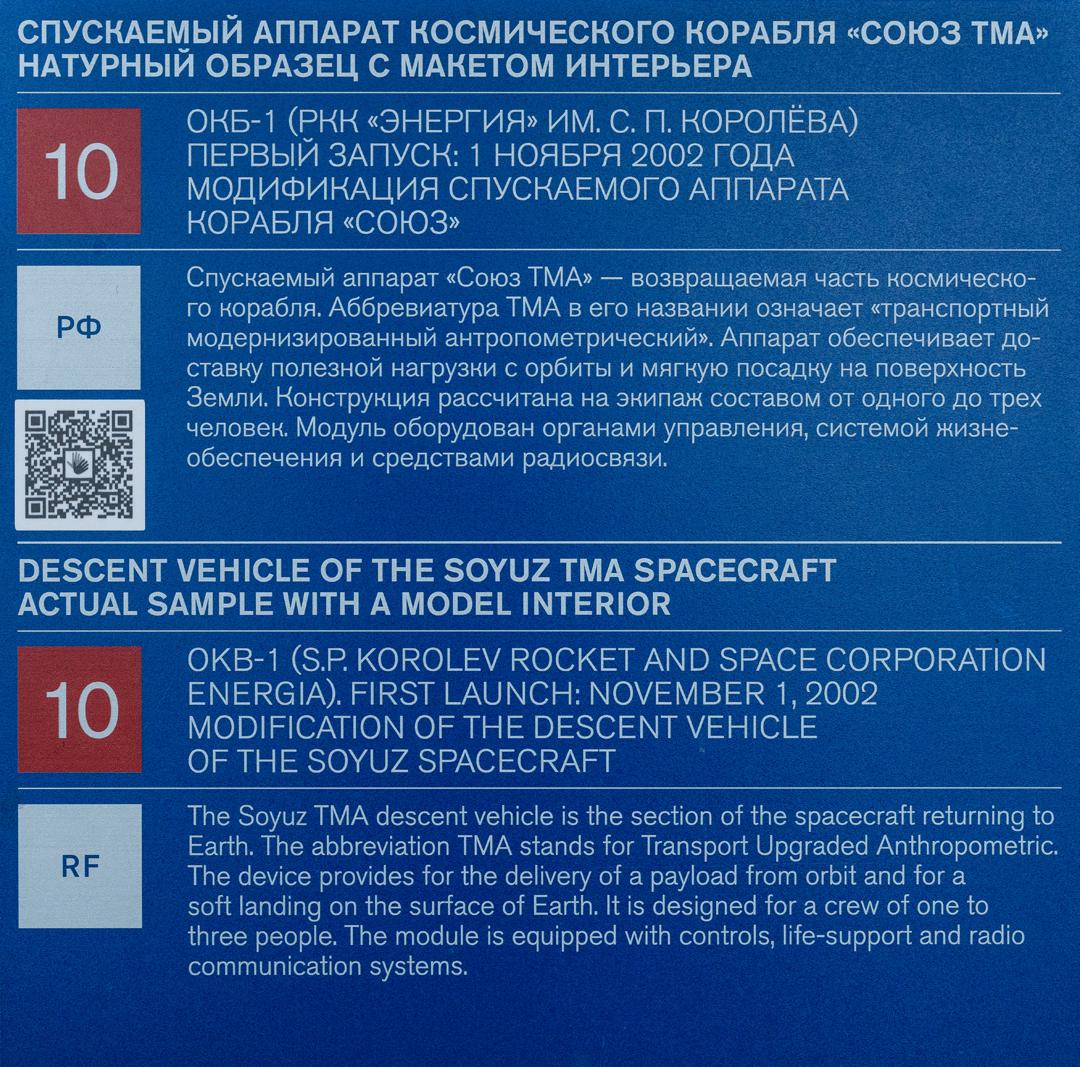 Подлинный спускаемый аппарат «Союз ТМА» - возвращаемая часть космического корабля. Совершил посадку 11 марта 2014 года. С борта Международной космической станции на Землю вернулись космонавты Олег Котов, Сергей Рязанский, Майкл Хопкинс.