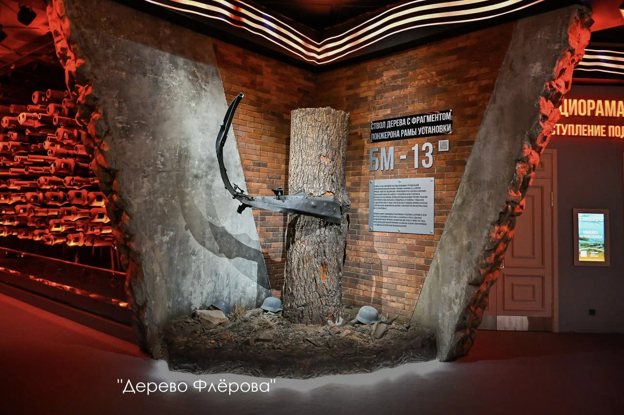 В ночь с 6 на 7 октября 1941 года командир 1-й отдельной экспериментальной батареи БМ-13, прозванных у бойцов «Катюшами», капитан И.А. Флёров принял свой последний бой. Произошло это у деревни Богатырь Смоленской области. Вместе с установками БМ-13 погибла большая часть бойцов. Перед гибелью командир принял решение подорвать установки, чтобы они не достались врагу. На месте подвига воинов капитана Флёрова было обнаружено дерево с фрагментом лонжерона рамы БМ-13.