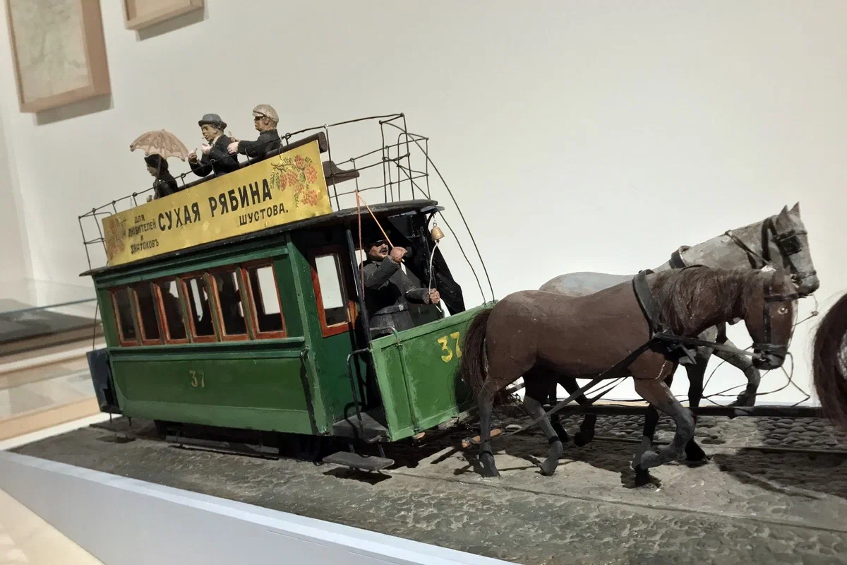 Технический прогресс затронул все стороны городской жизни. В 1872 году в Москве была протянута первая линия «конки» — трамвая, который по рельсам тянули лошади. Представленный в этом разделе макет конки запечатлел момент запряжки дополнительной пары лошадей — их впрягали на подъемах. Этому музейному макету почти 100 лет — его создали в 1930-х годах в качестве иллюстрации для раздела о дореволюционном транспорте. Конка была популярным и удобным транспортом, но просуществовала сравнительно недолго — в 1899 году в Москве появился электрический трамвай, а к 1912 году от конок совсем отказались.