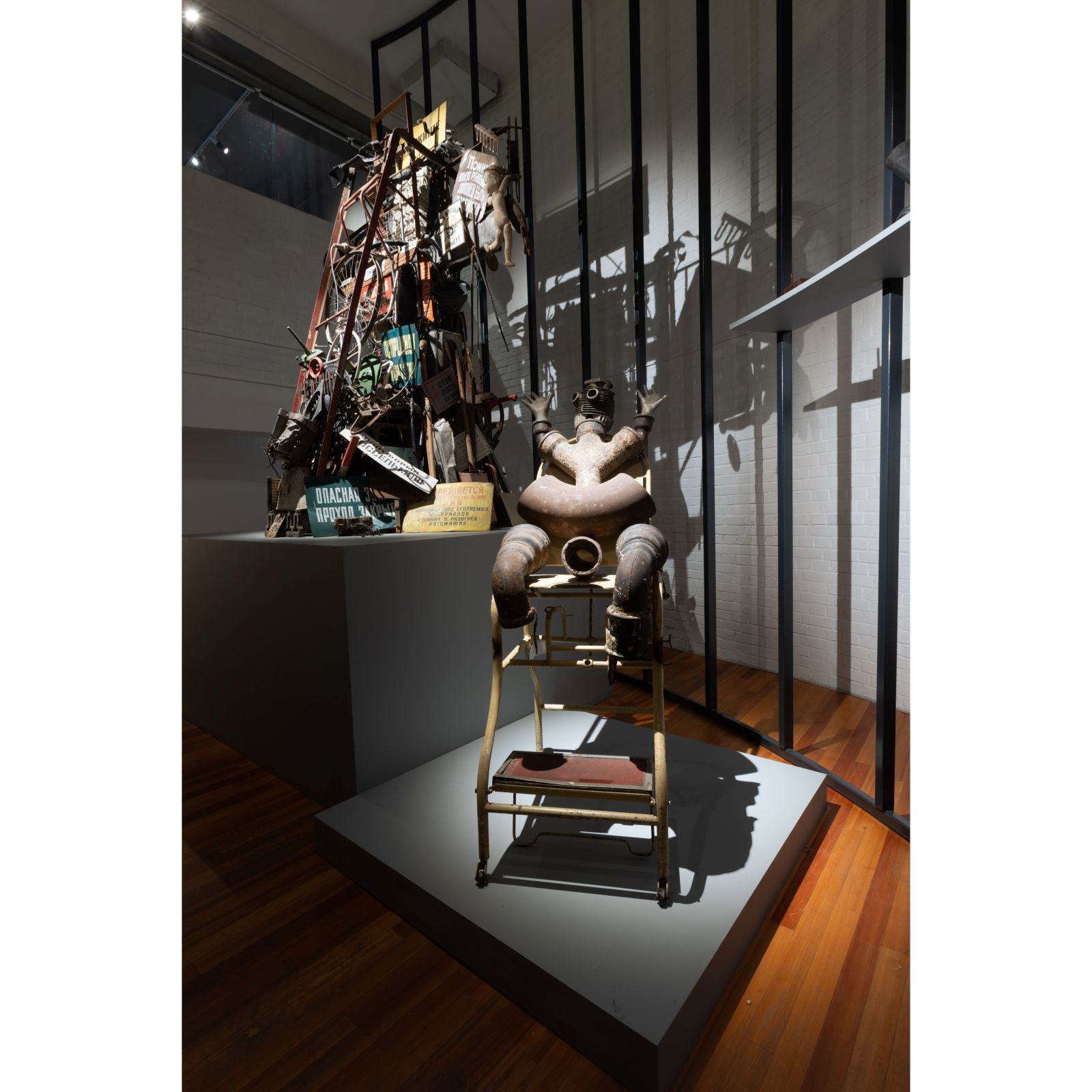 Особое место в экспозиции занимает работа “Железная леди” 1979 года. В этом произведении ржавое гинекологическое кресло служит постаментом для фигуры, составленной из водопроводных труб, а поднятые руки созданы из гипсовых слепков перчаток. Предметы утрачивают своё первоначальное значение, превращаясь в метафору распада человеческого тела и его объективации. Как говорил сам Сидур, современность разрушила “представление о мире, вещи и человеке, как о чем-то целом, нерушимом и гармоничном”.