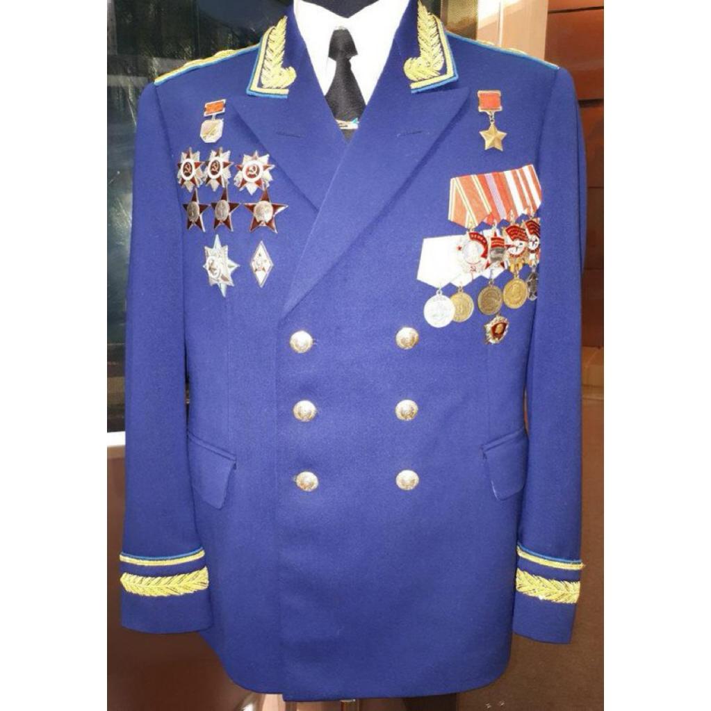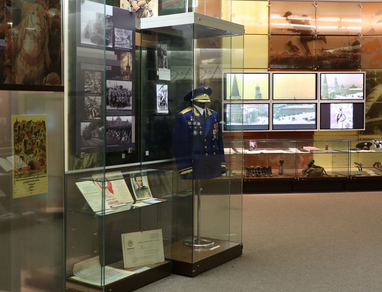 Витрина перед вами посвящена лётчику-истребителю Петру Васильевичу Базанову. Здесь находится комплект парадной формы Героя. Давайте проследим боевой путь лётчика по его наградам.