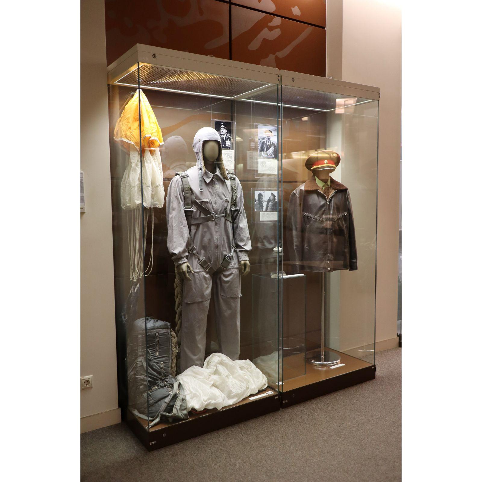 В 1960-х годах в строй Советской Армии встала боевая машина десанта. Впервые парашютисты при высадке в тыл врага получили усиление бронёй. Однако пустая бронемашина и члены экипажа могли приземлиться в совершенно разных местах. Командующий ВДВ Василий Маргелов поставил задачу: сделать возможным приземление экипажа вместе с машиной, внутри неё. Так был создан парашютный комплекс «Кентавр». При испытаниях в комплексе успешно приземлились манекены, затем собаки. Настала очередь человека-испытателя. Среди всех добровольцев Василий Филиппович выбрал собственного сына, Александра Маргелова. Его фотопортрет находится в левой части витрины. Александр Васильевич, инженер десантных войск, был опытным парашютистом. Однако личных парашютов – таких, как вы видите в витрине – испытатели «Кентавра» не имели, поскольку внутри машины были закреплены в амортизирующих креслах. В случае отказа внешнего парашюта спастись из машины было невозможно. Но «Кентавр» не подвёл. Первое в мире десантирование людей внутри машины в 1973-м году прошло успешно.