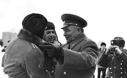 Фотография «Старший инженер Научно-технического комитета Воздушно-десантных войск майор А. В. Маргелов докладывает командующему Воздушно-десантными войсками генералу армии В. Ф. Маргелову о результатах испытаний. 1976 год».