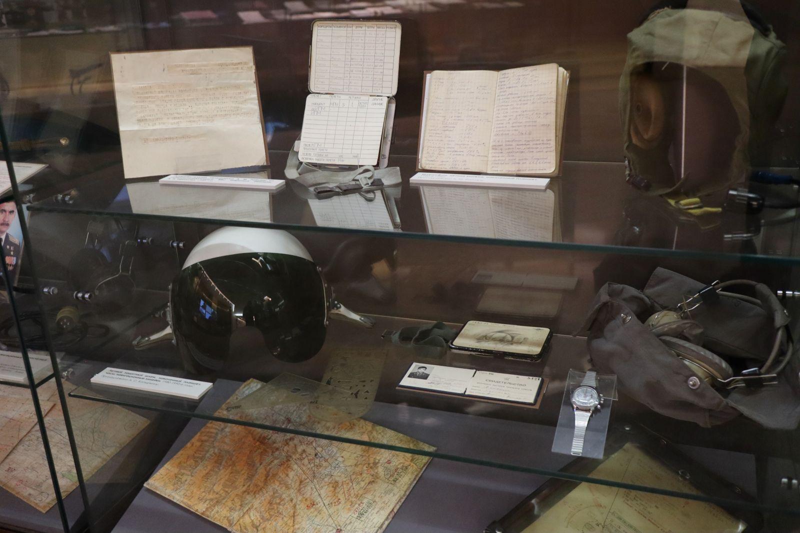 На фотографии в центре стенда запечатлены двое летчиков возле своего вертолёта. Это Герой Советского Союза пилот Александр Райлян и его штурман. В витрине вы видите лётное снаряжение Героя. В Афганистане Александр Максимович совершил более четырехсот боевых вылетов. Это и штурмовки вражеских позиций, и высадки десанта, и самые важные задачи по вывозу с поля боя раненых солдат.