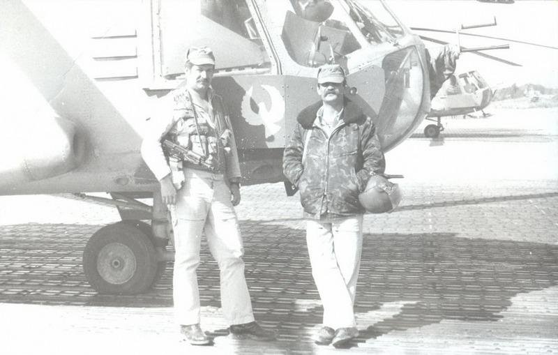 Фотография «А. М. Райлян (справа) и штурман эскадрильи А. П. Селиванов у вертолёта МИ-8-МТ».