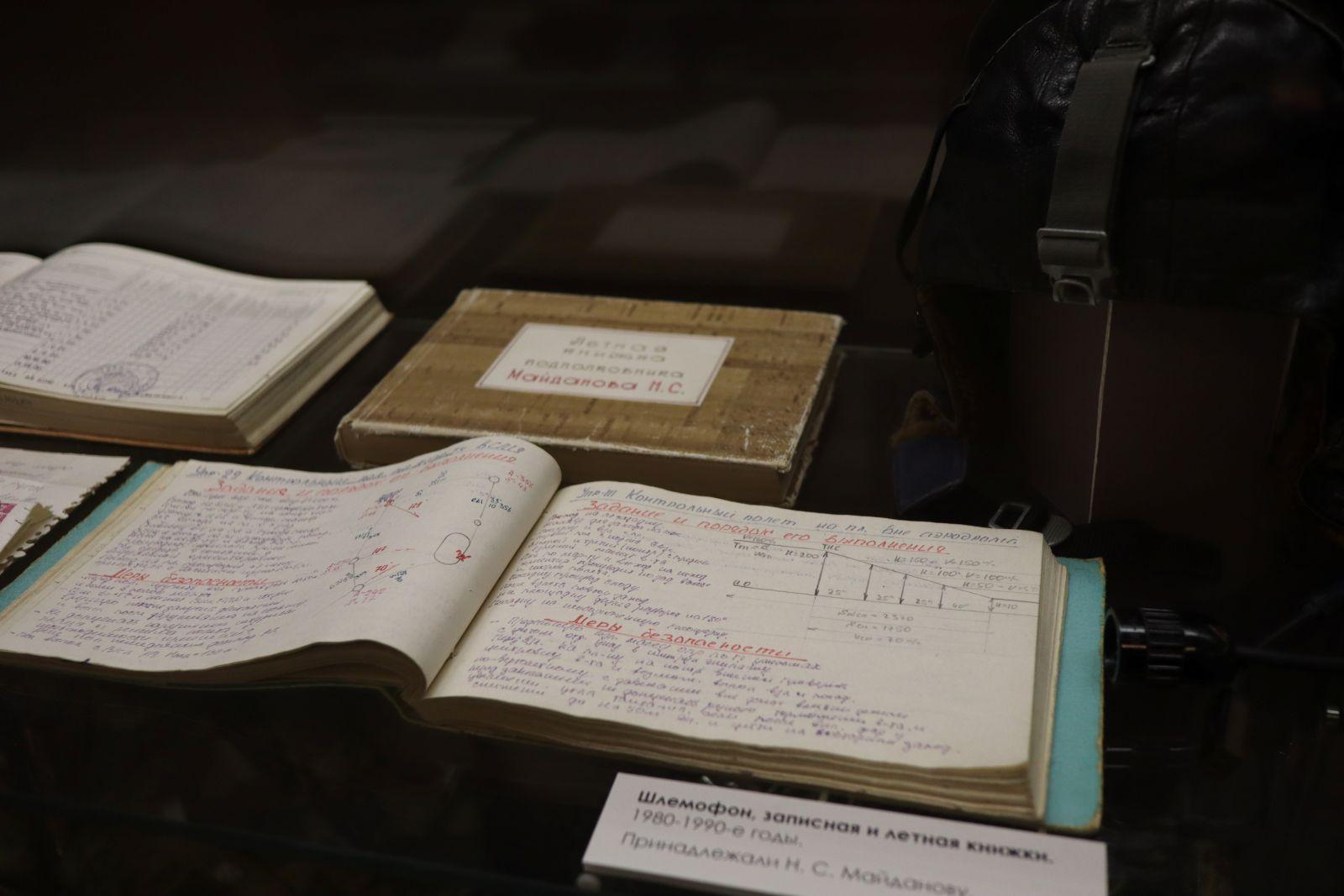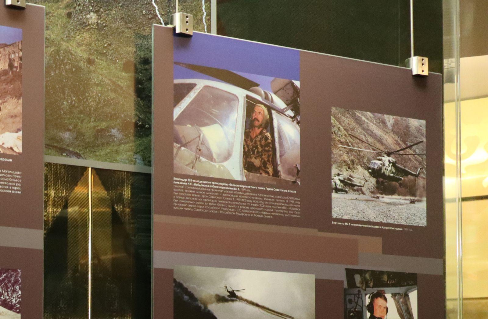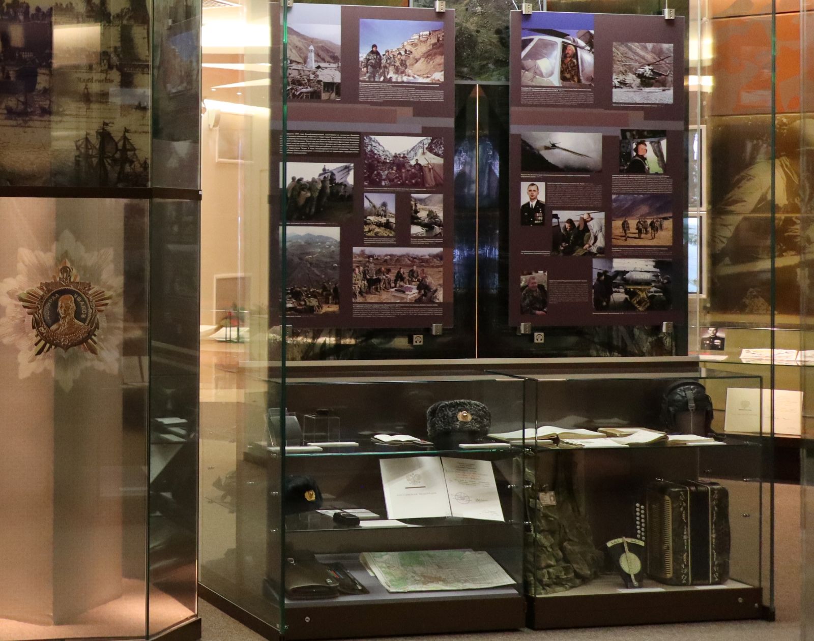 В Российской армии продолжили службу многие ветераны Афганской войны. На фотоснимке в верхней части стенда – Герой Советского Союза, полковник Николай Майданов, в кабине своего вертолёта. В Афганистане пилот десятки раз вывозил бойцов из-под смертельного огня. К той же рискованной работе – вытаскивать людей из лап смерти – он вернулся в Чечне. Майданов обладал душой, широкой, как меха его гармони, которая находится в витрине. Эта широкая душа всегда заслоняла других от опасности. На все самые тяжёлые операции командир полка летал лично. А в ходе операции бросался в самое пекло, отвлекая огонь на себя. А ведь вертолёт Ми-8, на котором летал Герой – это в первую очередь транспорт. На фотографиях хорошо видно широкое остекление его кабины. Это стекло, да еще шлемофон на голове, как в витрине перед вами – вот и вся защита для пилота.
