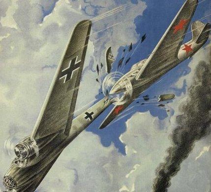 Но настоящим экзаменом для Харитонова стал его первый боевой вылет. Обнаружив вражеский бомбардировщик, лётчик атаковал его по всем правилам. И внезапно обнаружил, что его пулемёты не стреляют. Не желая упускать врага, Харитонов под огнем подобрался к самому хвосту «юнкерса». Теперь хватило бы и одной очереди – но пулемёты молчали. И тогда, как изображено на плакате вверху, Герой, своим пропеллером рубанул по хвосту врага.