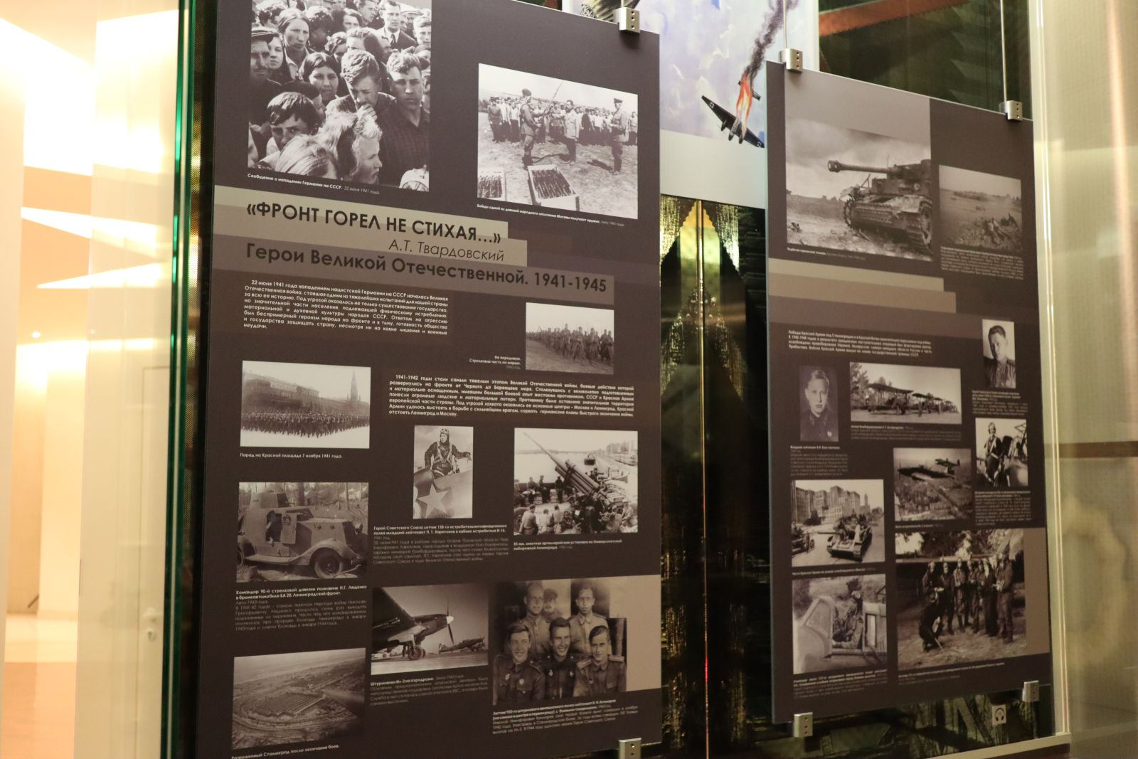С самого начала Великой Отечественной войны советский народ проявлял массовый героизм. Так, уже в июне 1941-го несколько лётчиков-истребителей совершили воздушные тараны. Это были первые награжденные Герои Великой Отечественной. В их числе – Пётр Харитонов, чья фотография находится в центре стенда. Ниже в витрине – автобиография Героя. Как вы можете прочесть, Пётр Тимофеевич родился и вырос в глухой тамбовской деревне, в семье пастуха. Однако этот деревенский парень, пройдя аэроклуб и школу летчиков, поднялся в воздух за штурвалом самолета.