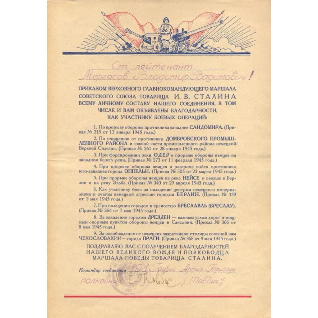 Грамота благодарственная «Сталинская» ст. лейтенанту Мергасову В.В.