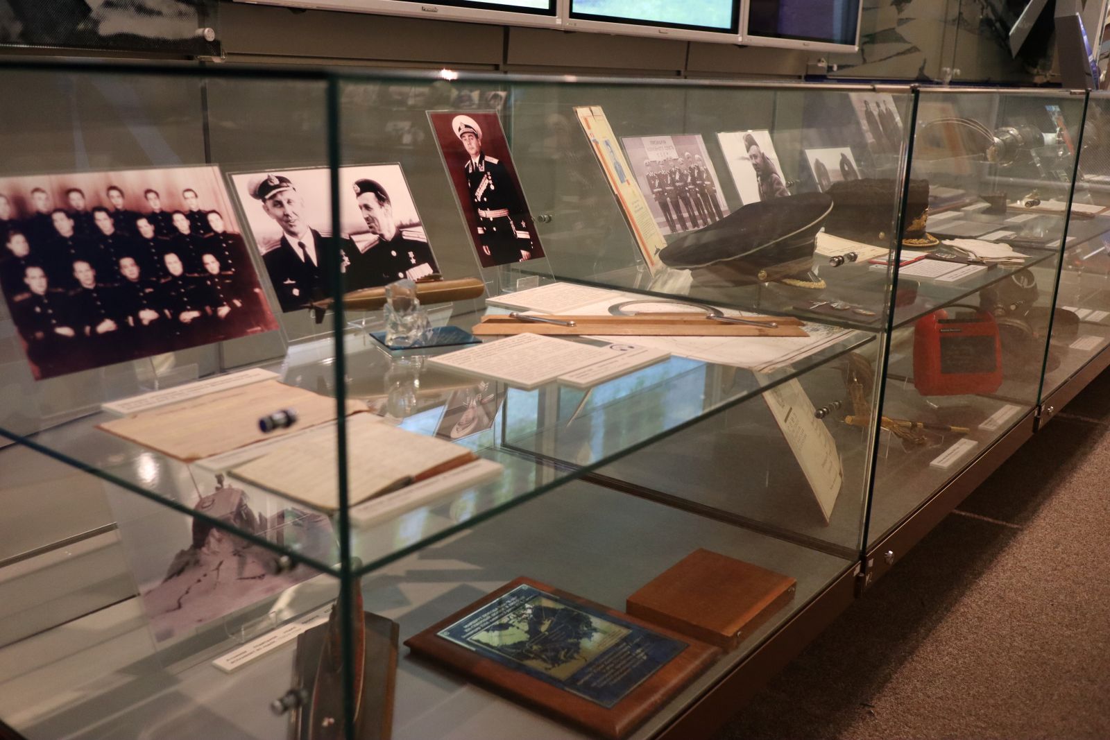 На советском флоте Полюс впервые достигла подводная лодка под командованием Льва Михайловича Жильцова в 1962-м году. Он запечатлён на фотоснимке в центральной части витрины перед вами. Однако первое в мировой истории всплытие на Полюсе совершил годом позже другой командир – Юрий Сысоев. Его фотопортрет вы видите в правой части витрины. В центре витрины помещён макет подводной лодки Сысоева в сравнении с толщей льда. Подвиг Юрия Александровича как командира сложился из целого ряда достижений всего экипажа. Это и безошибочное прибытие в точку Полюса под сплошным льдом, и своевременное обнаружение небольшой полыньи, и ювелирной точности всплытие через неё. Фотография внизу витрины запечатлела, как всплывшая подлодка возвышается надо льдами.