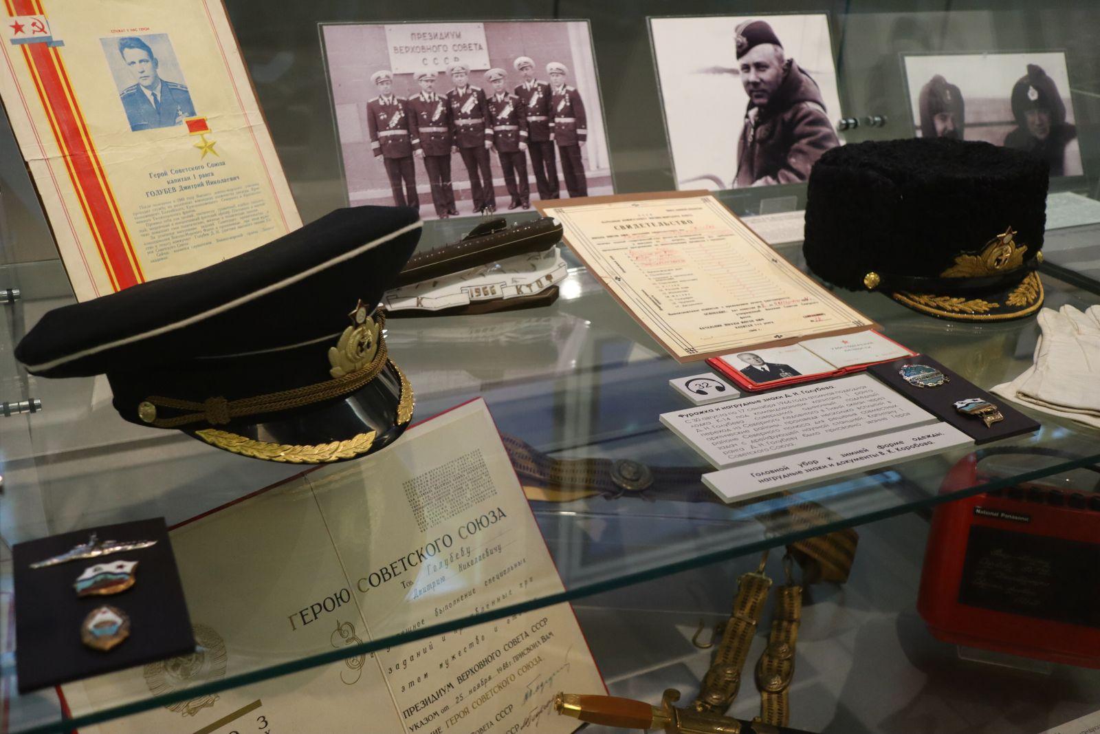 В центре витрины перед вами находится документ времён Великой Отечественной войны. Как можно прочесть, 16-летний юнга Вадим Коробов на отлично освоил специальность радиста. Рядом в витрине вы видите фотопортрет бывшего юнги через тридцать лет, а чуть ниже – его золочёный адмиральский пояс и кортик.