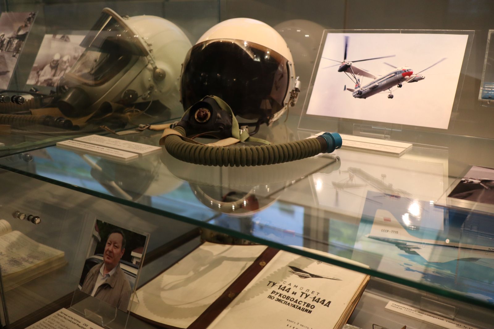 В витрине перед вами – лётный шлем, принадлежавший испытателю, Владимиру Матвееву. Его фотопортрет находится в нижней части витрины. Владимир Николаевич решил стать испытателем ещё в детстве, когда впервые увидел в небе реактивный самолёт. Вместе с Матвеевым в школу испытателей поступали пятьсот человек, а поступили тринадцать. Шестеро из этого выпуска погибли.