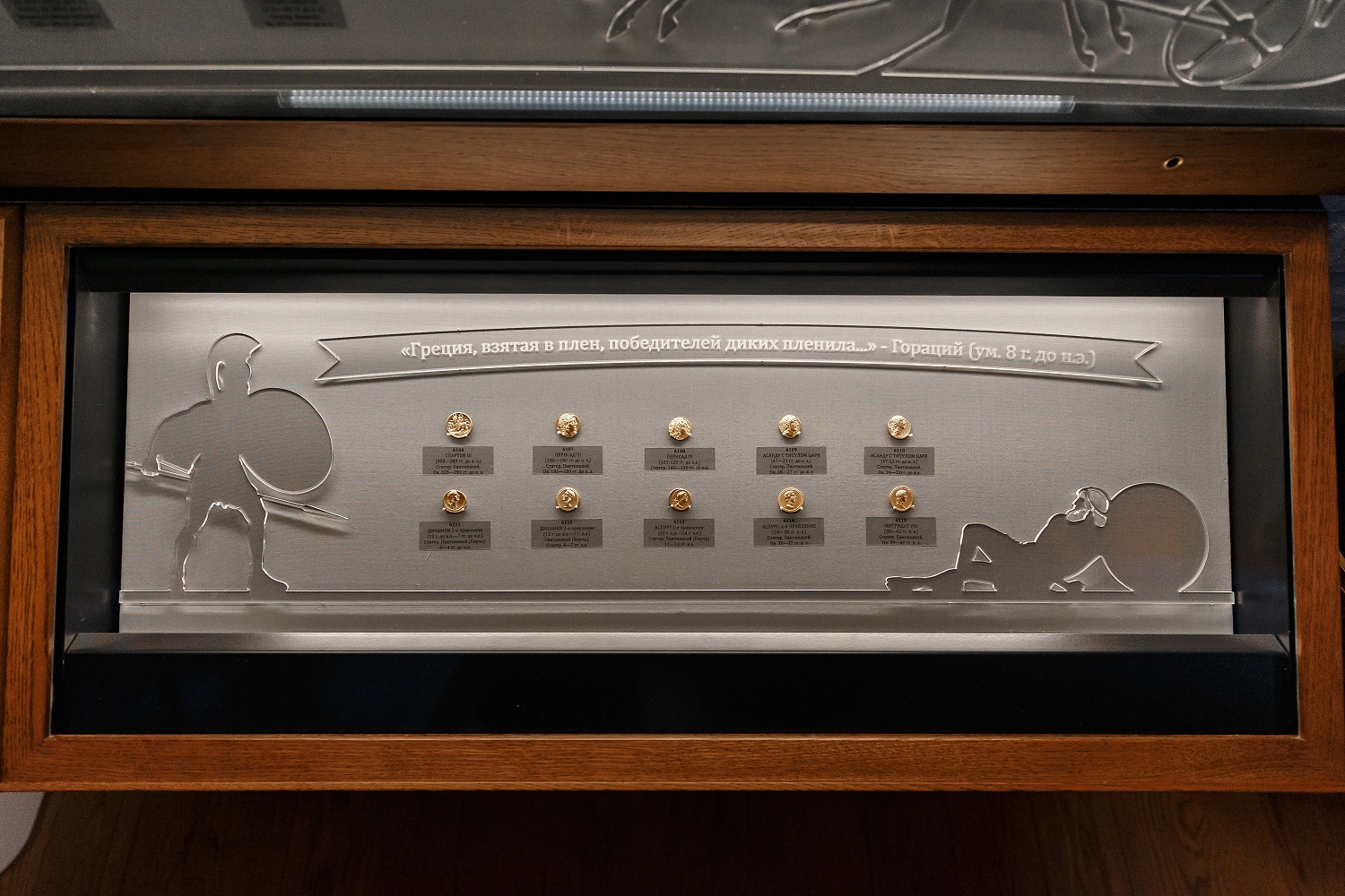 В экспозиции представлены монеты знаменитых правителей Александрии Египетской Птолемеев и деньги с портретами римских правителей – свидетельства того удивительного времени, когда завоёванная менее развитыми народами Греция подняла их цивилизацию на невиданную высоту. Наряду с этим экспозиция знакомит с подлинной греческой керамикой, от амфор для хранения зерна и оливкового масла до расписной керамики и светильников.