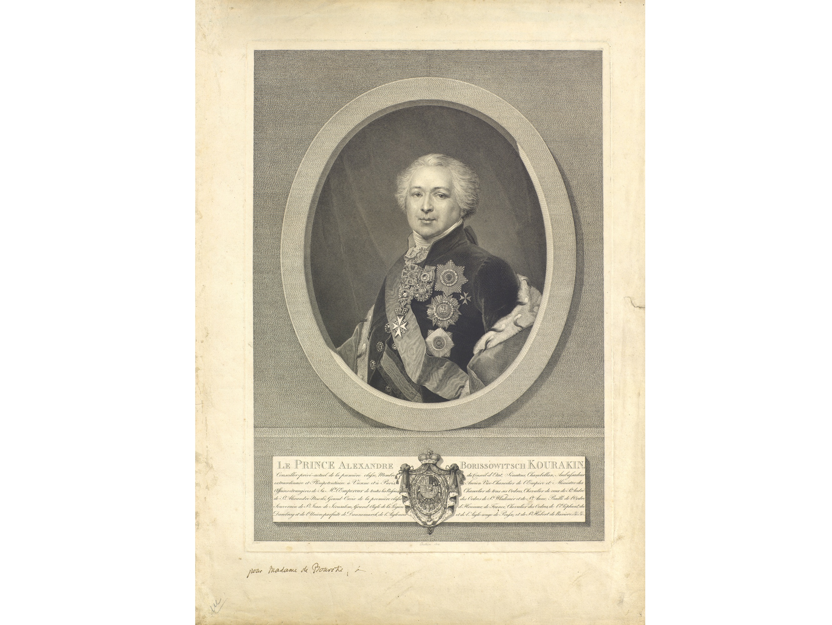 Осенью 1808 года российским послом в Париже стал князь Александр Борисович Куракин. Проницательный дипломат, Куракин еще в 1810-1811 годах заметил признаки надвигающейся войны. О замыслах Наполеона Александру Борисовичу было немало известно, в том числе и благодаря разведывательной сети, работавшей «под крышей» посольства. Но об этом большинство современников не догадывалось. Куракин запомнился им, прежде всего, как «бриллиантовый князь». Он обладал огромным состоянием и его костюм всегда был усыпан драгоценностями. Летом 1810 года, по случаю брака Наполеона с дочерью австрийского императора, австрийский посол князь Шварценберг устроил в своем особняке бал, на котором присутствовал и Куракин. Неожиданно вспыхнул пожар, началась паника. Куракина вытащили из горящего здания без сознания. Очевидец вспоминал, что «платье на нем горело, и его тушили водой из лужи, между тем как другие отрезали бриллиантовые пуговицы с его одежды». Говорят, князь лишился бриллиантов на сумму в 70 тысяч франков.
