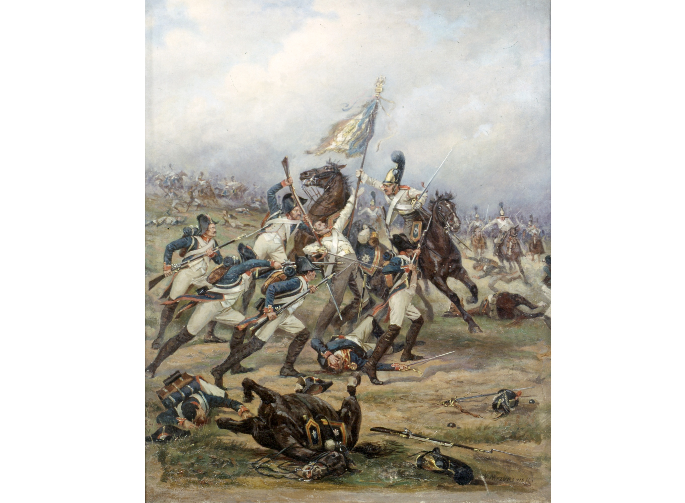 В сражение при Аустерлице 20 ноября (2 декабря) 1805 года Наполеону удалось неожиданным манёвром прорвать центр российской-австрийской армии. Навстречу французским войскам из резерва выдвинулась Российская гвардия. Около полудня Лейб-гвардии Конный полк стремительной атакой буквально втоптал в землю 1-й батальон французского 4-го линейного пехотного полка. На картине Виктора Викентьевича Мазуровского изображен один из эпизодов боя. Во время схватки рядовой Гаврилов подобрал с земли брошенное французское знамя с бронзовым навершием в форме орла. Конногвардеец был тут же исколот штыками, но успел передать трофей своему сослуживцу Омечльченко. Этот подвиг Кутузов особо отметил в письме командовавшему гвардией великому князю Константину Павловичу.