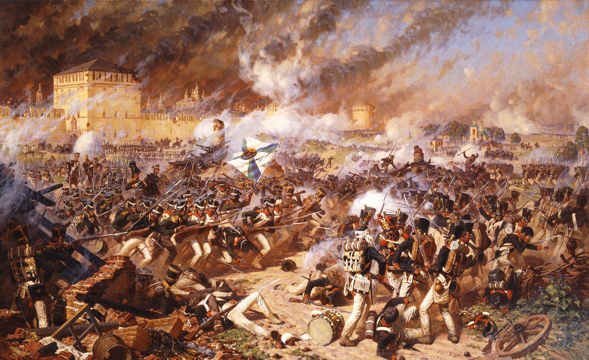 В начале августа 1812 года российские армии Барклая де Толли и Багратиона соединились под Смоленском. Туда же с главными силами двинулся и Наполеон. 17 августа Наполеон приказал начать генеральный штурм. На картине Александра Аверьянова показан бой у Малаховских ворот Смоленска.