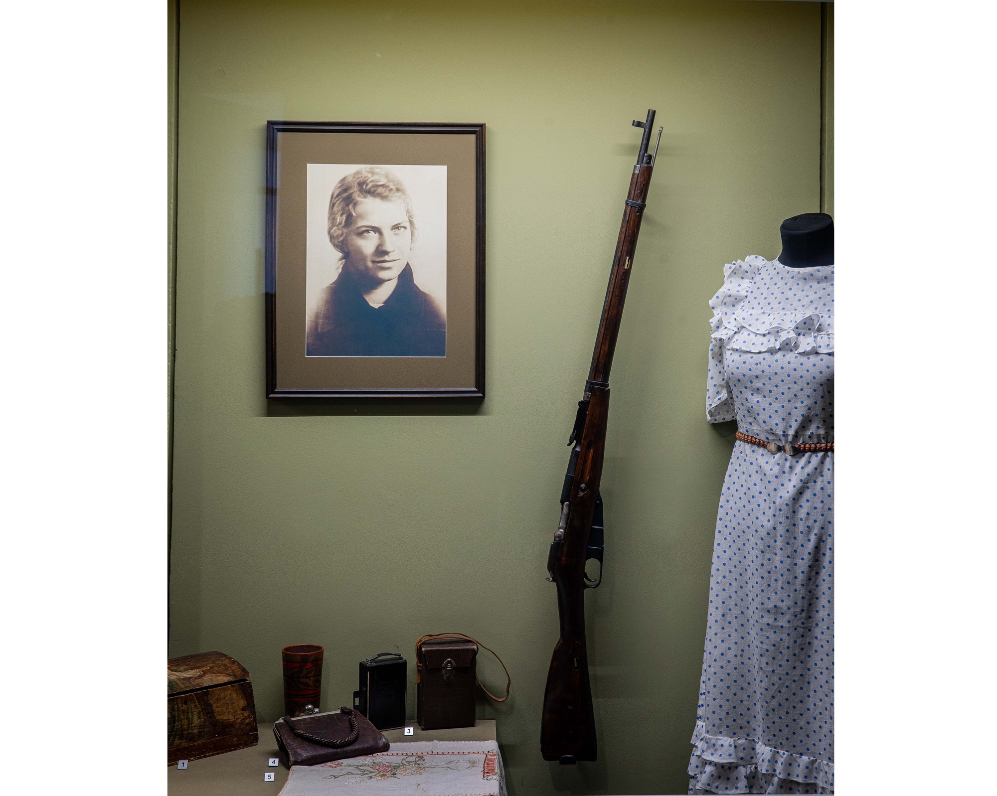 В витрине представлены личные вещи Н.В. Ковшовой – шкатулка для рукоделия, карандашница, фотоаппарат «АРФО», театральная сумочка, салфетка, вышитая Н.В. Ковшовой, её выпускное платье.