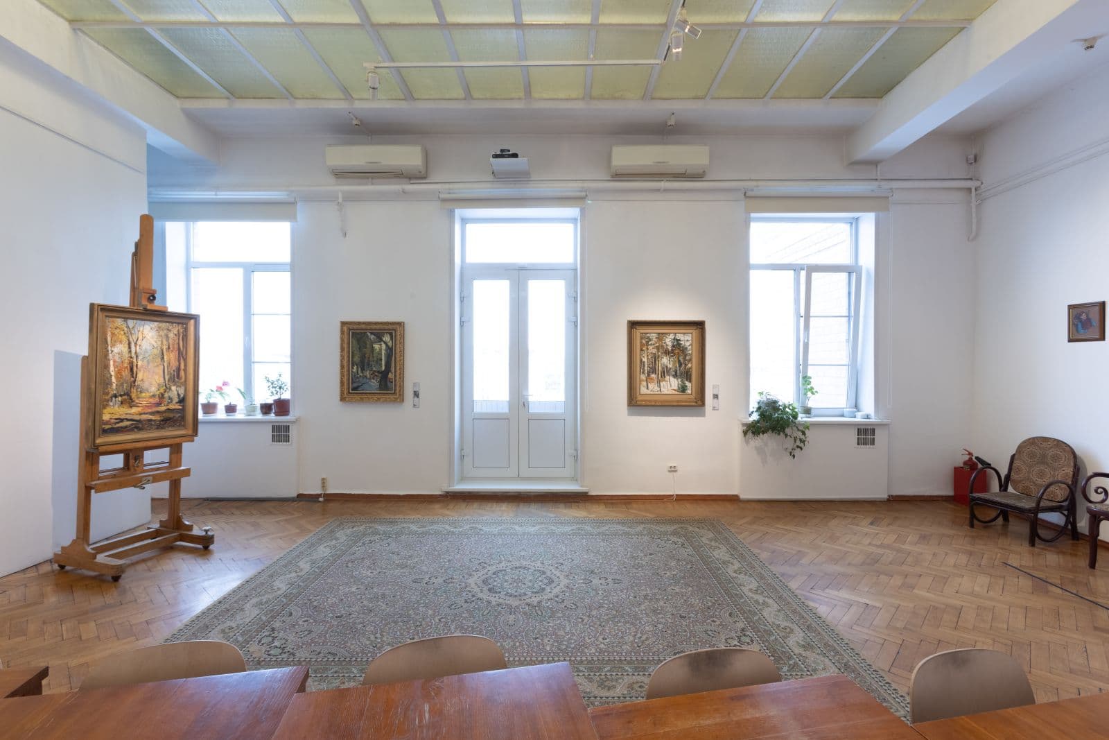 Если посмотреть в окно, можно заметить такой же световой фонарь в соседнем доме. Подобные мастерские с верхним естественным освещением создавались только для лауреатов Сталинских и Ленинских премий. Сейчас они остаются свидетельствами тех мест, где жила и работала творческая элита советского времени.