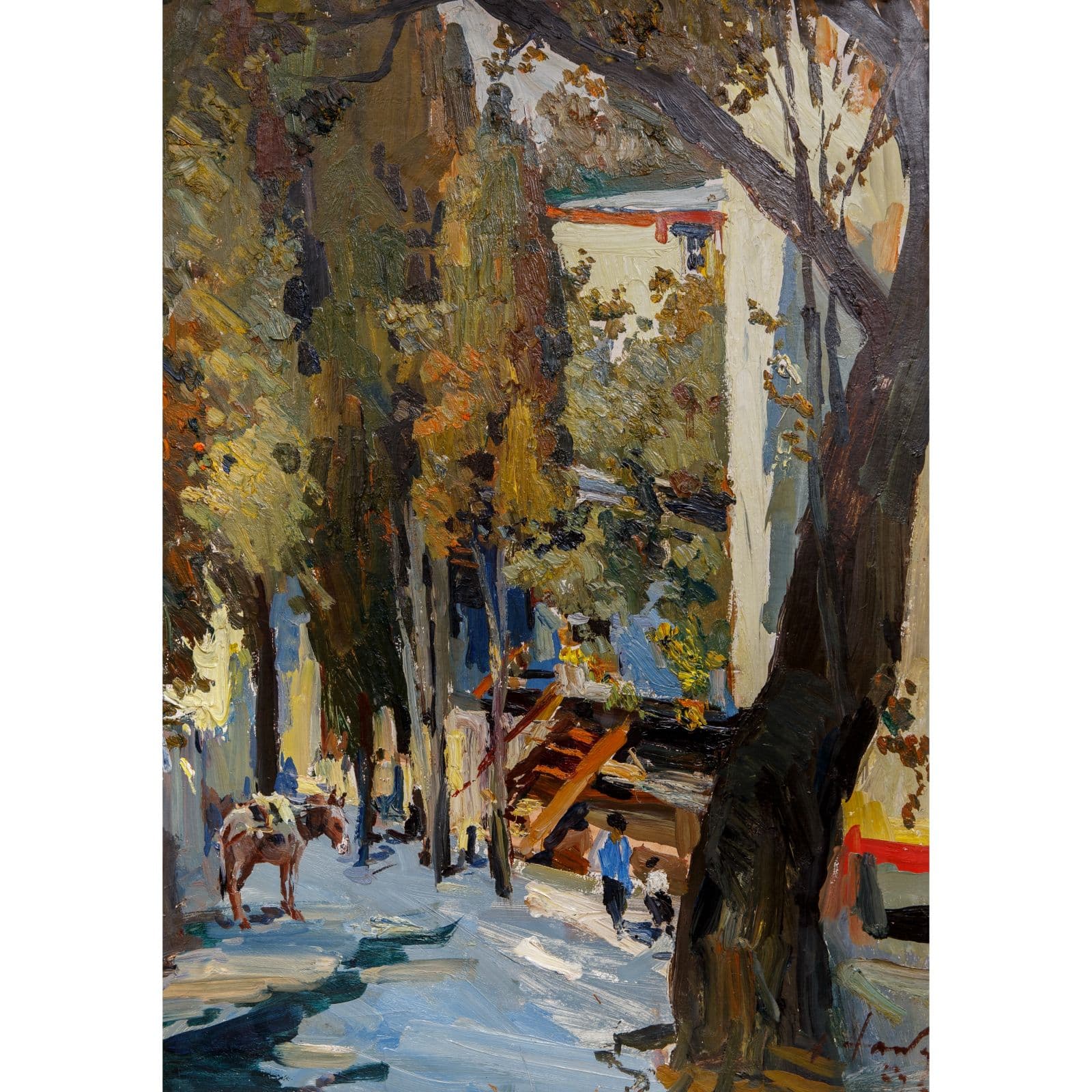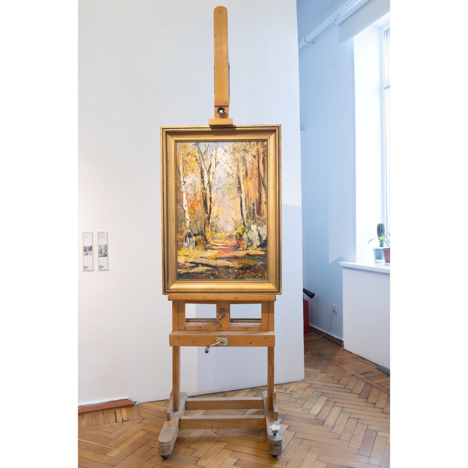Перед вами мольберт, которым пользовался Налбандян, с помещенным на него осенним пейзажем, созданным на даче художника. Он часто писал пейзажи с натуры, с этюдником работал по всему Подмосковью: в Можайске, Звенигороде, Загорске, Волоколамске.