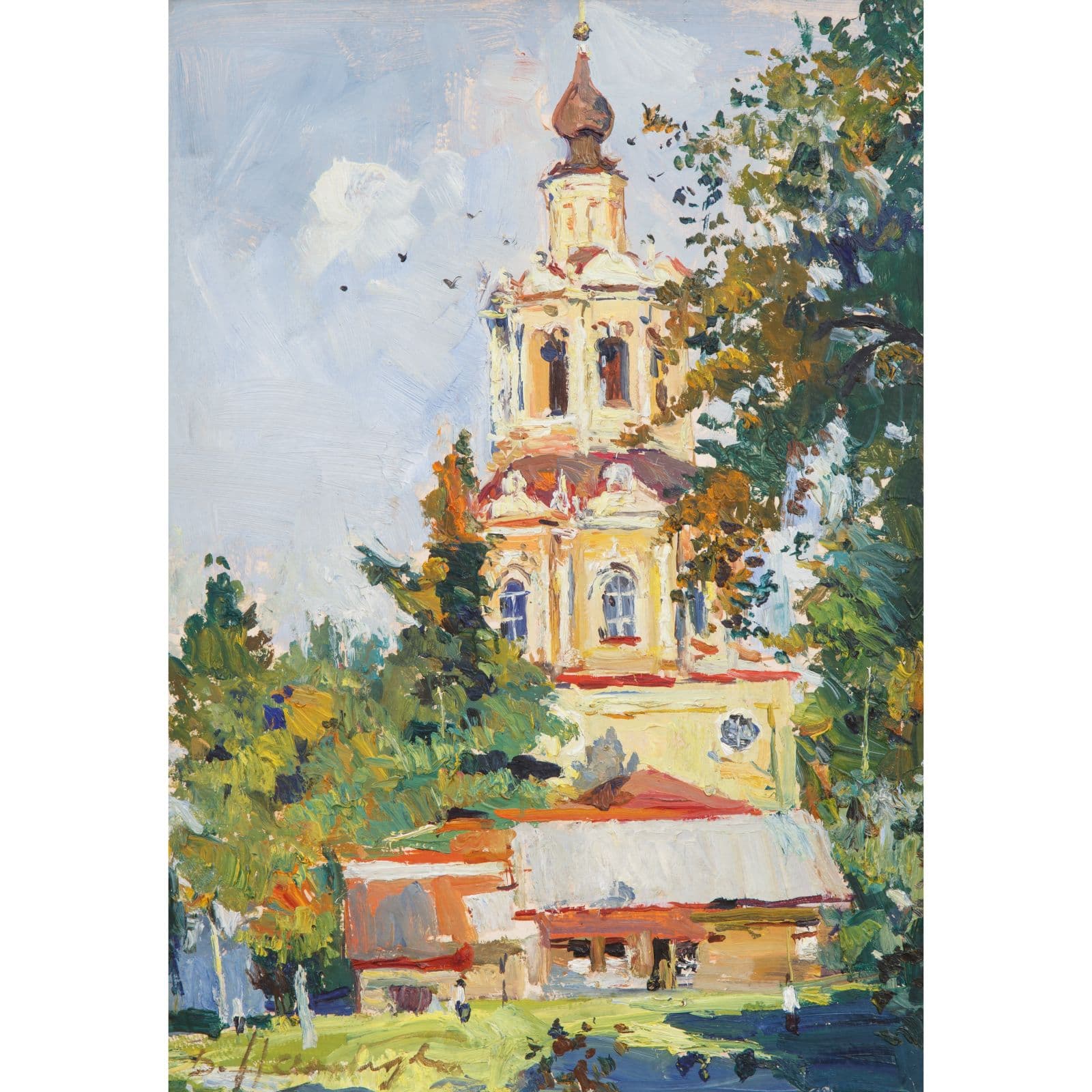 Оттого достаточно сложно выявить его авторский почерк. Налбандян – художник гибкий. Он не вырабатывает свою систему, но идет по пути схватывания преобладающих тенденций. В пейзаже, на который вы смотрите, это тоже выражено. Период Оттепели принес ослабление идеологического контроля, что отразилось и в живописи – художники получили возможность изображать церковные постройки. Согласно требованиям времени, такие архитектурные объекты можно было представлять исключительно как памятники зодчества, но не как культовые сооружения. Другой важный аспект состоит в том, что на момент написания работы церковь в Уборах, как и другие религиозные постройки на территории СССР, не функционировала как действующий храм. Именно этим объясняется характерная композиционная особенность – кресты на куполах часто оказываются скрытыми за рамкой картины. Работа Налбандяна здесь становится маркером эпохи.