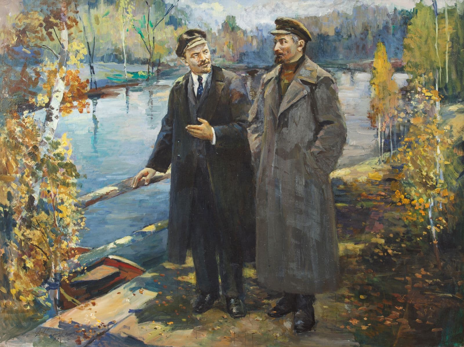 Сцена будто балансирует на грани официального канона и его невольного переосмысления. Где происходит действие? В подмосковных Го́рках? Или это аллегорическое пространство? Течение реки, вызывающей ассоциации с рекой времени, направлено не вперед к будущему, но, скорее, уходит в прошлое.