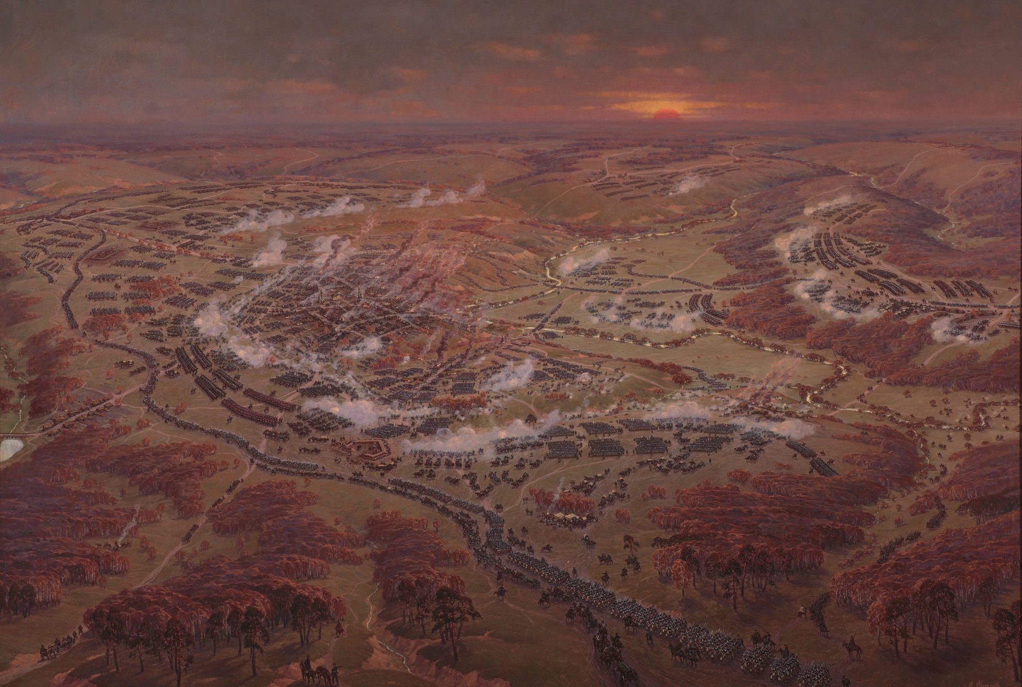 Малоярославец раскинулся на высоком правом берегу реки Лужи. Город охвачен огнем. В ходе сражения он 8 раз переходил из рук в руки и был почти полностью уничтожен.