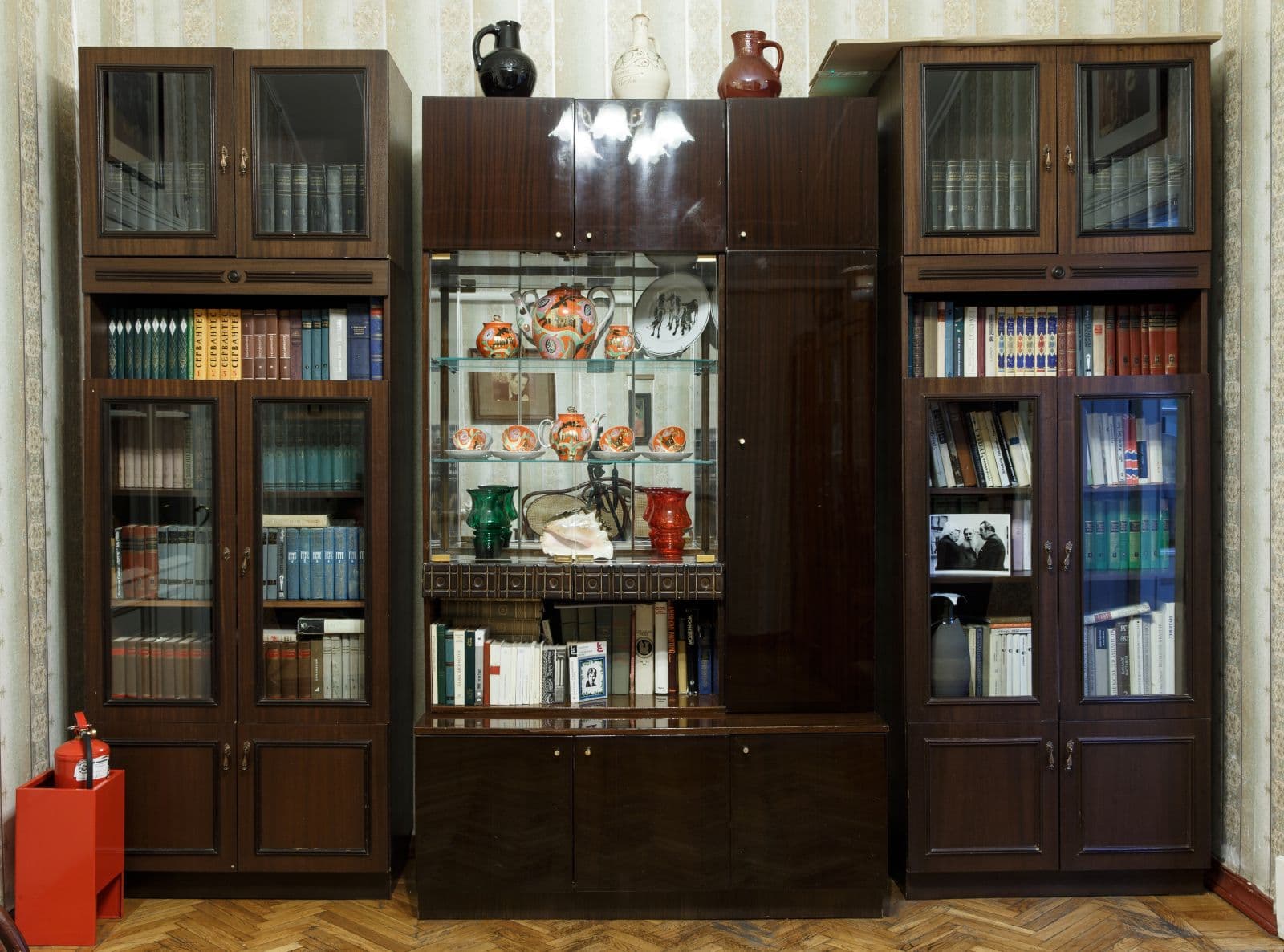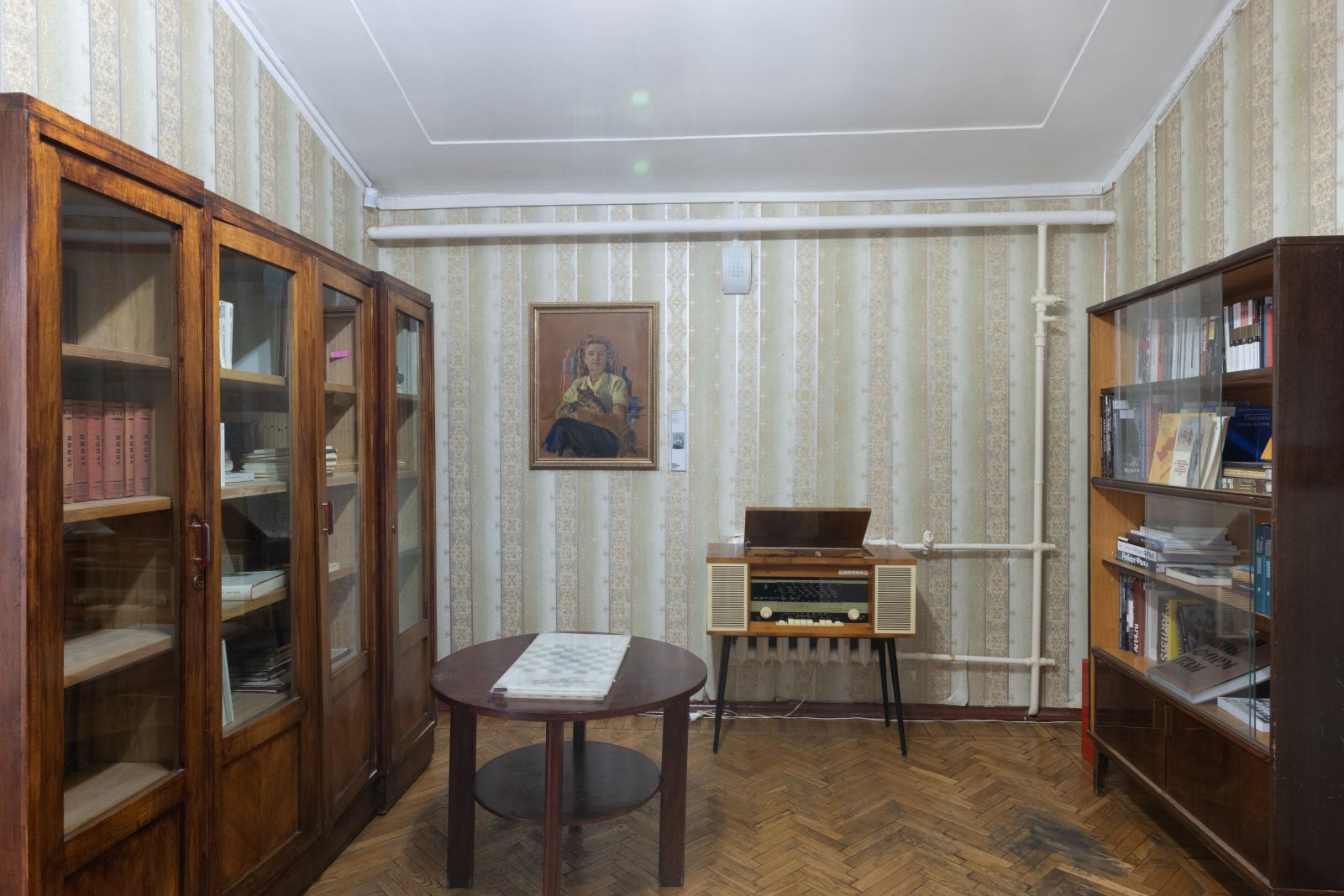 Перед вами собрание книг из личной библиотеки Дмитрия Налбандяна. Левый шкаф сохранил подлинную коллекцию художника – здесь представлены издания, которые он и его жена Валентина читали на протяжении жизни. Полное собрания сочинений Ленина и Сталина соседствуют с альбомами по искусству античности и Ренесса́нса. Отдельный интерес представляет книга с переписками Ван Гога. Этот набор отражает двойственность интересов художника – официальную идеологическую основу, “идейность” и увлеченность классическим искусством.
