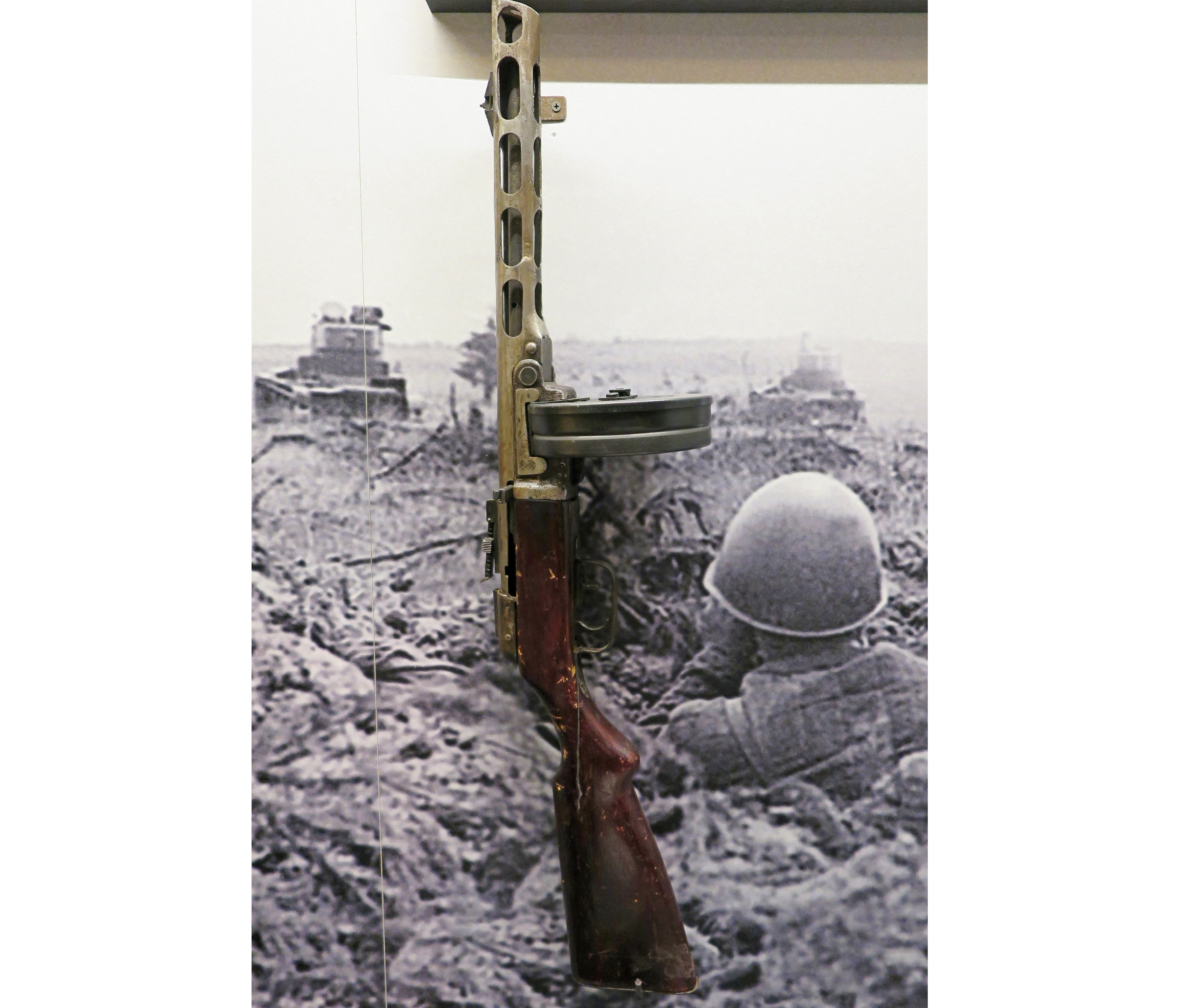Этот пистолет-пулемёт был принят на вооружение Красной Армии в декабре 1940 года, но в массовом порядке его начали производить после начала войны. По сравнению с ППД-40 ППШ-41 был более надежным в эксплуатации и имел большую дальность стрельбы - 500 метров против 200 у ППД. Он немного похож на ППД внешне - главным образом из-за диска и по этой причине некоторые посетители их путают. Пистолет-пулемёт Шпагина стал одним из символов Великой Победы, его изображение можно увидеть на многих памятниках.