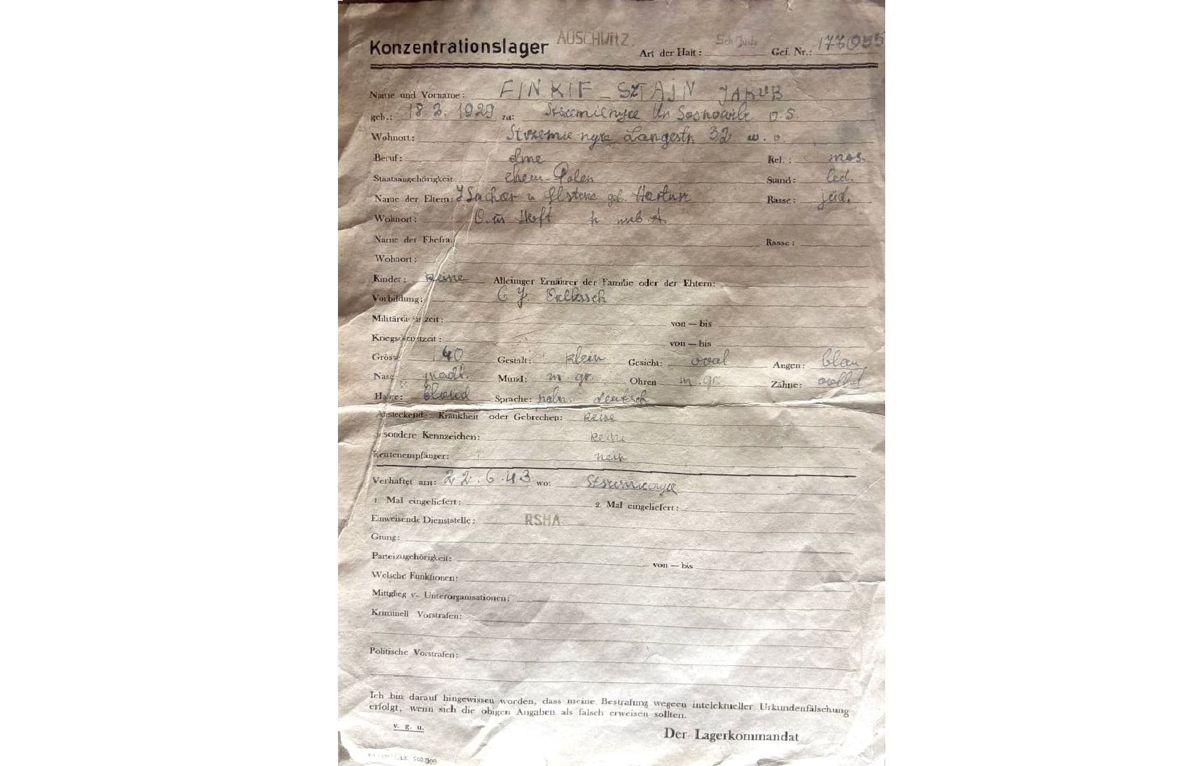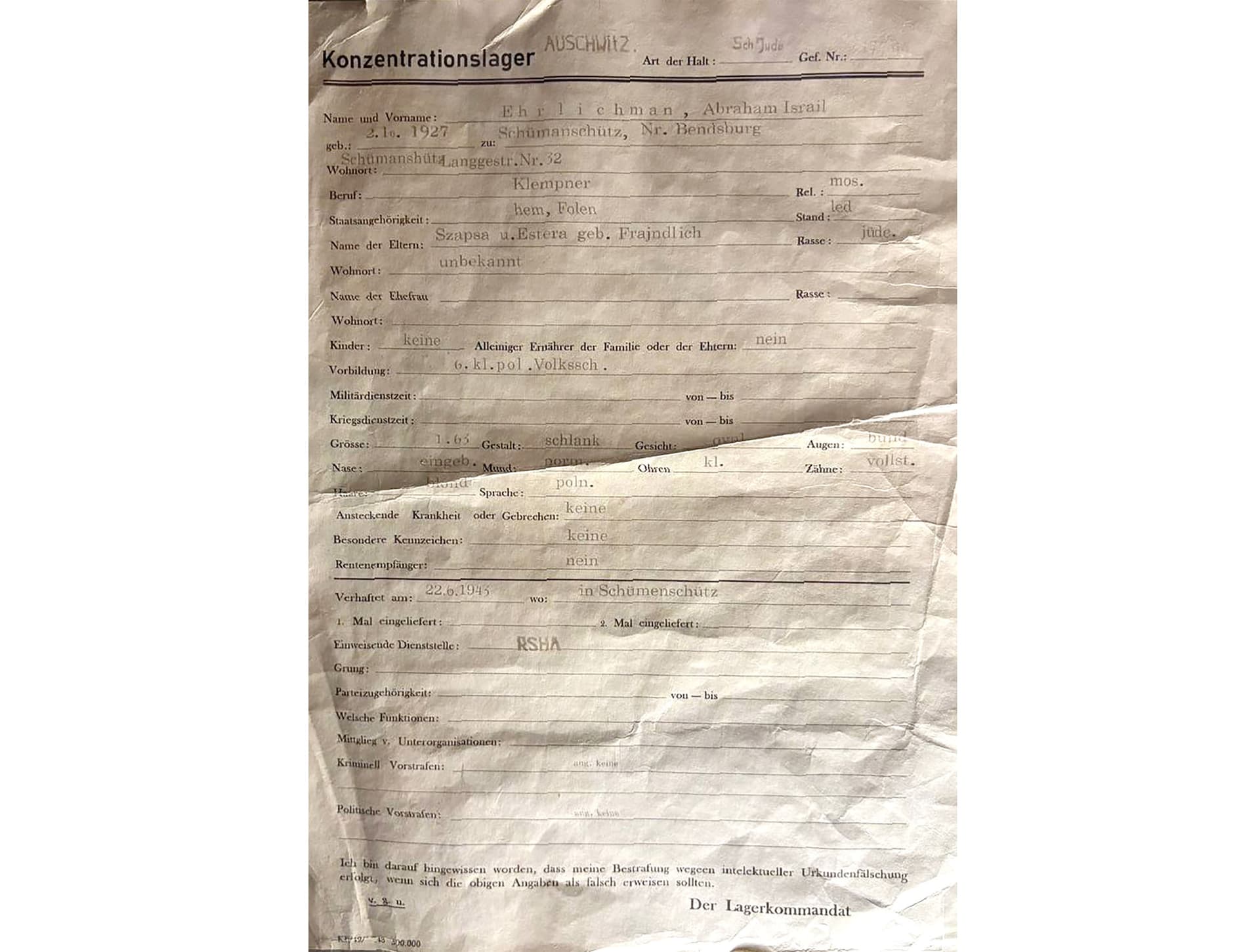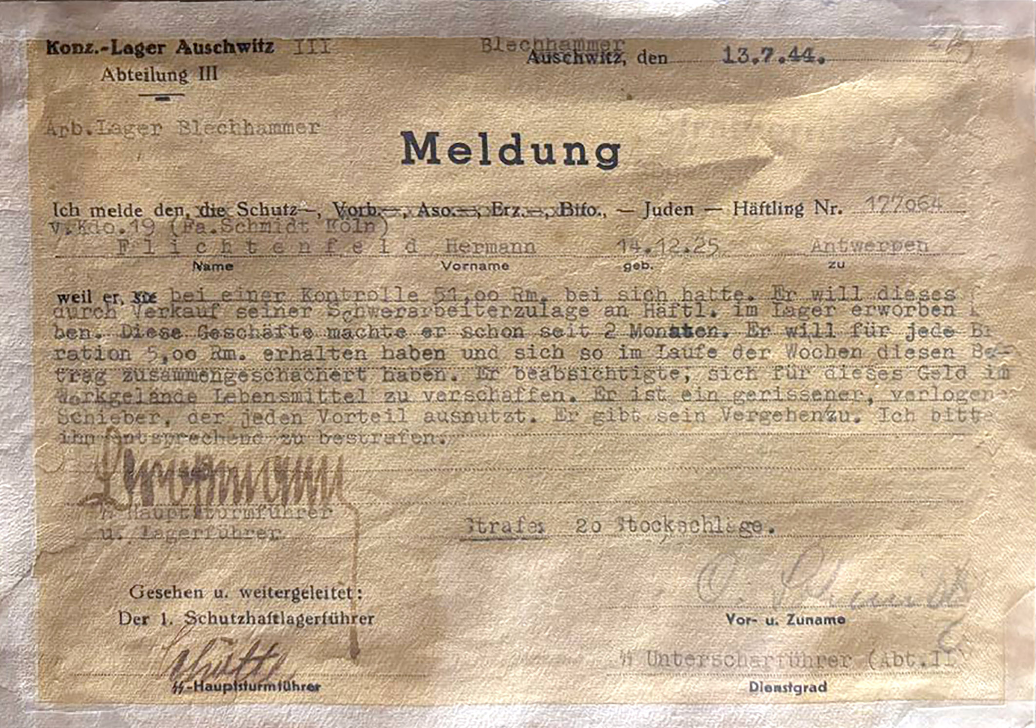 По прибытию в Аушвиц, узники проходили отбор и те из них, кто был признан пригодным врачами СС для работы, направлялись для регистрации. Рудольф Хёсс, начальник лагеря, в первых же день заявлял им, что они "... прибыли в концентрационный лагерь, из которого выход только один - через трубу крематория".