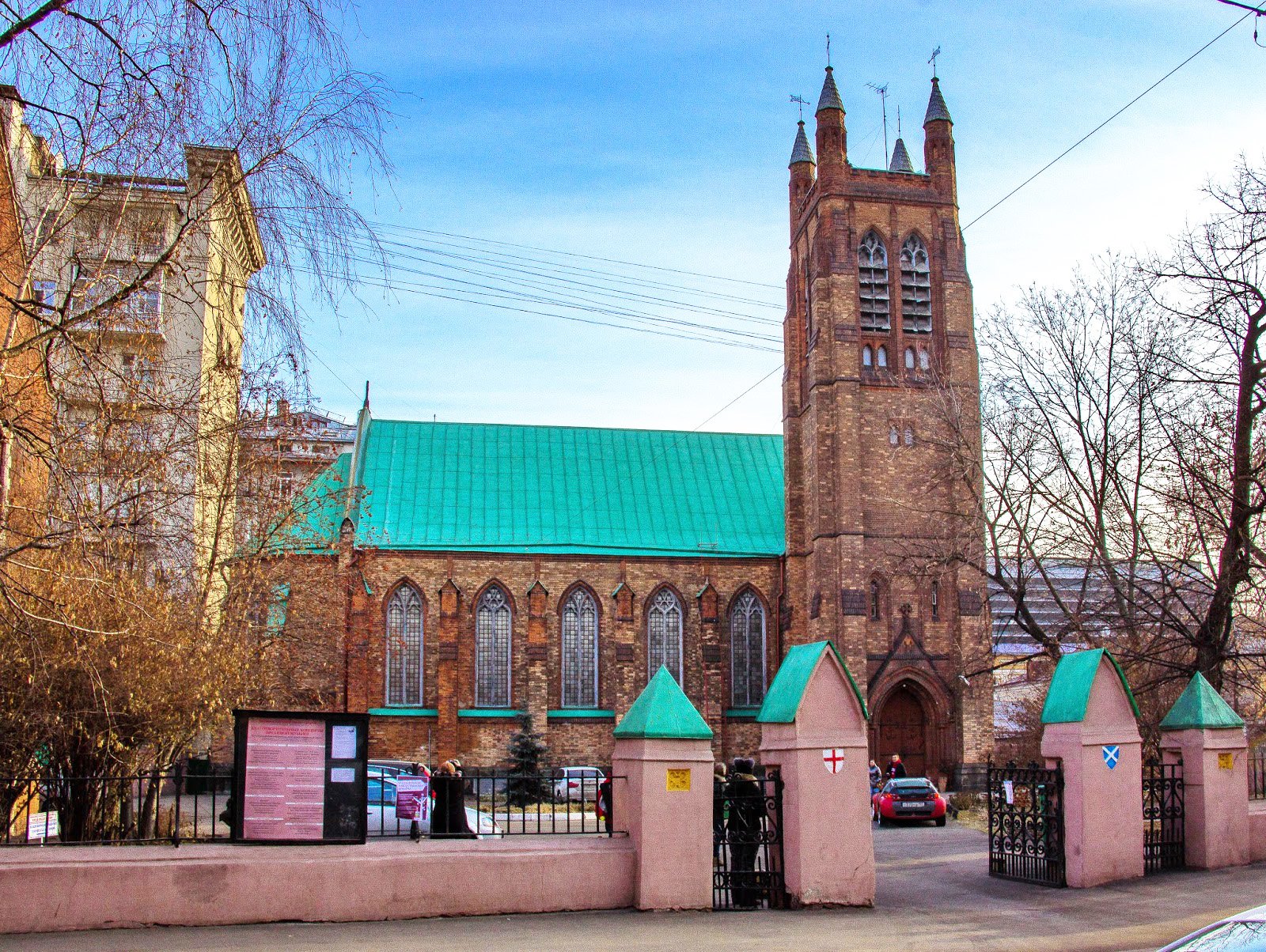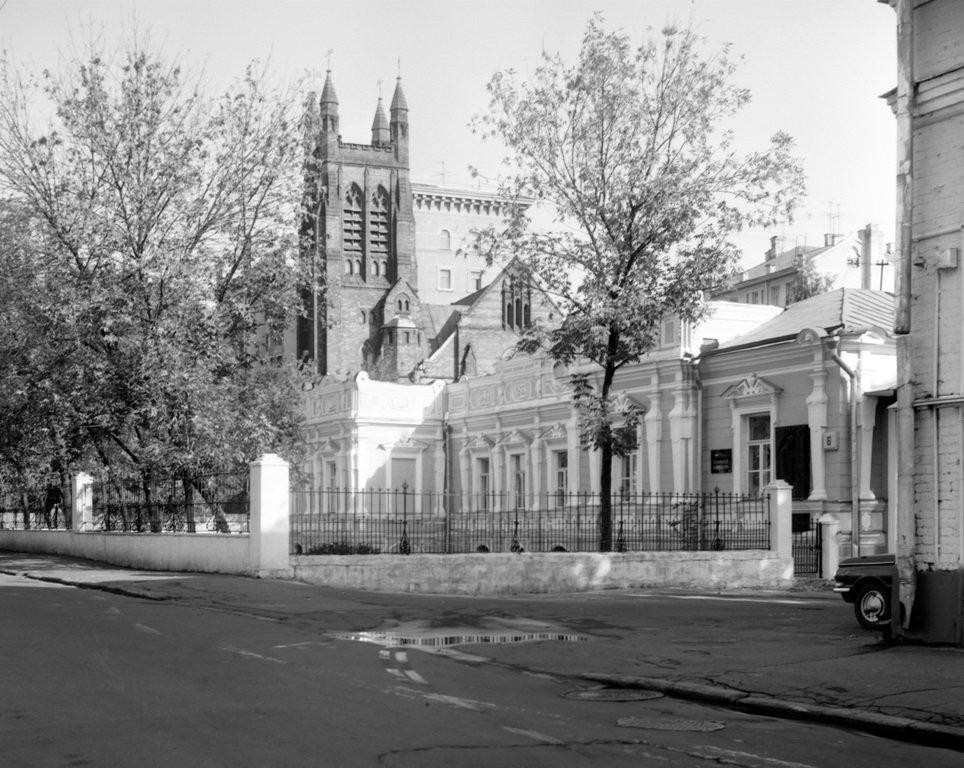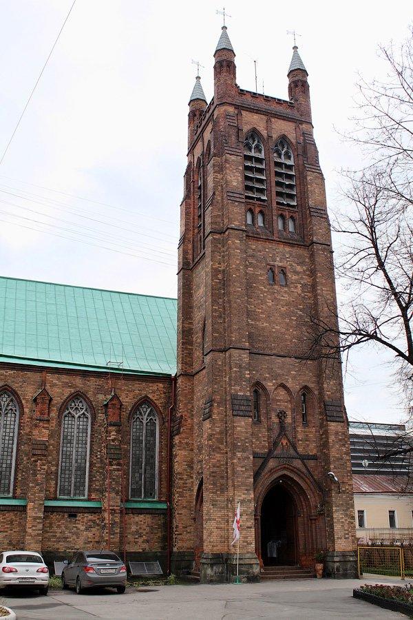 В Вознесенском переулке на фоне невысоких зданий ярко смотрится выполненная из красного кирпича стройная башня с вытянутыми готическими окнами и остроконечными завершениями на углах. Здесь можно беспрепятственно окунуться в атмосферу Англии, которая царит в этих стенах уже много лет.