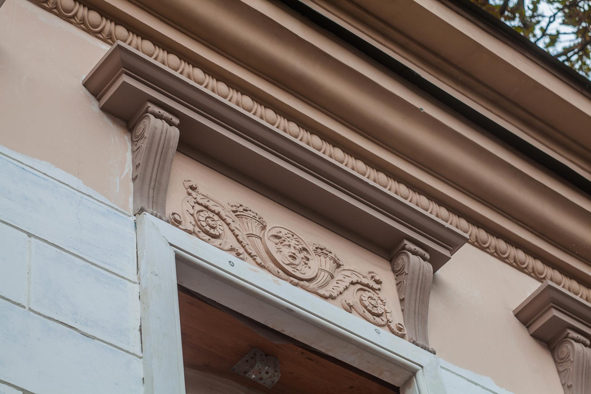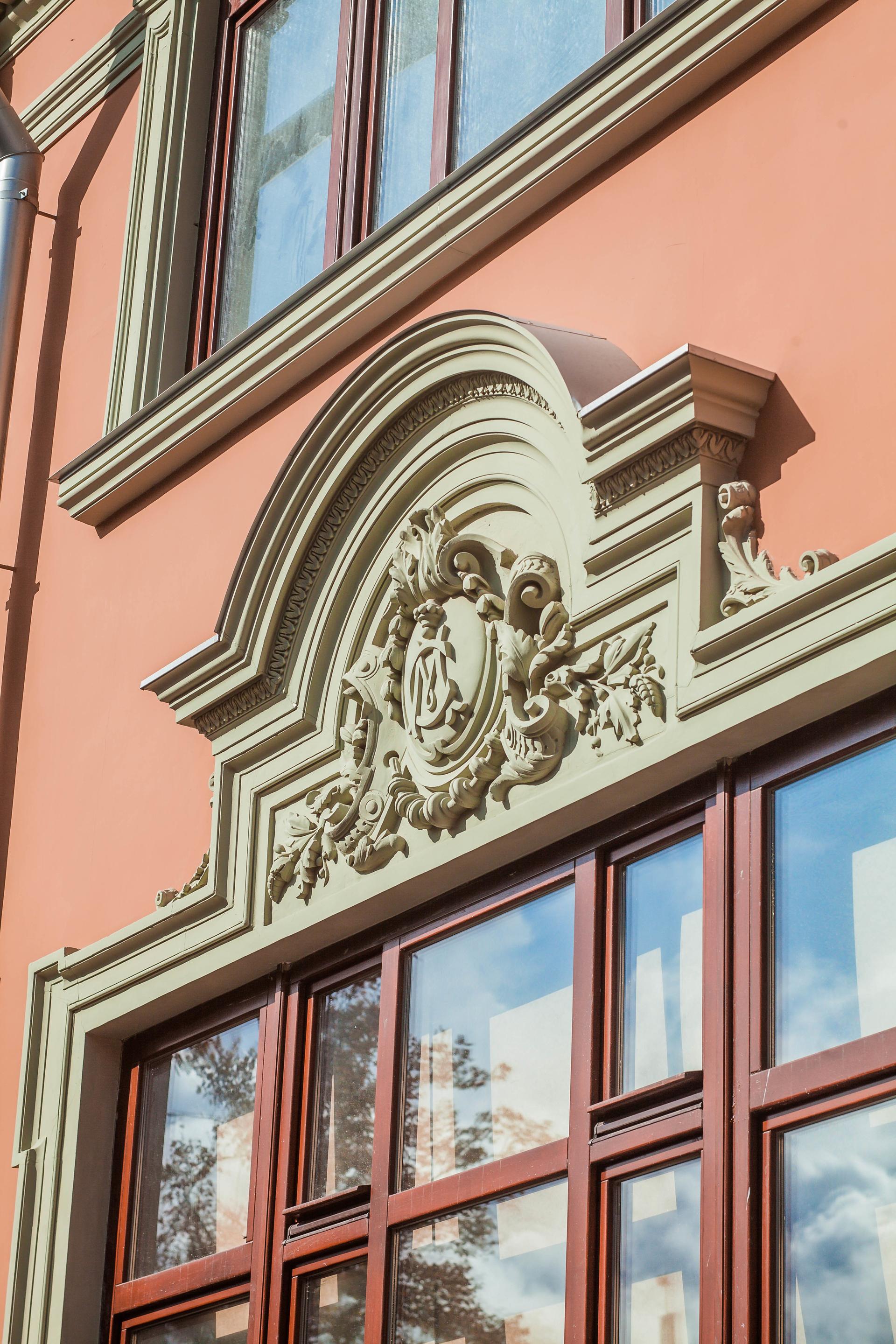 Богато украшенные окна особняка Мейера венчает вензель владельца «СМ». Латинские буквы, обозначающие имя и фамилию хозяина, долгое время вводили в заблуждение местных жителей, которые приписывали дом Савве Морозову.