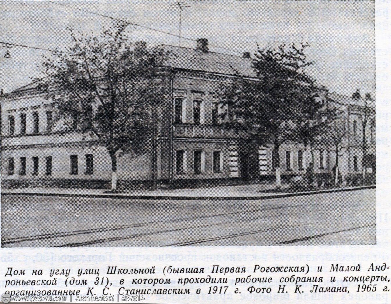 Две главные улицы Рогожской слободы – Воронья (ныне – Сергия Радонежского) и 1‑я Рогожская (ныне – Школьная) сохранились и поныне. Но если Воронья практически полностью изменила свой внешний вид (в 1980‑е годы была снесена вся историческая застройка четной стороны, а сама улица существенно расширена), то 1‑я Рогожская сохранила свой дореволюционный облик. В старину она носила и иные названия: Крутоярская (по питейному дому «Крутой яр») и Тележная. Последнее название часто встречается в мемуаристике, но документально не подтверждается. Застроена она была каменными двухэтажными домами, в которых в основном располагались постоялые дворы и лавки по продаже телег, экипажей и шорного товара. Несмотря на свою немалую ширину (и по современным меркам это далеко не самая узкая улица), здесь всегда царила толчея. По воспоминаниям современника, «на ней с раннего утра толпился народ, и она представляла большую ярмарку. Движение народа, обозов, троек со звенящими бубенцами – всё это ее очень оживляло, и она резко отличалась от всех московских улиц».