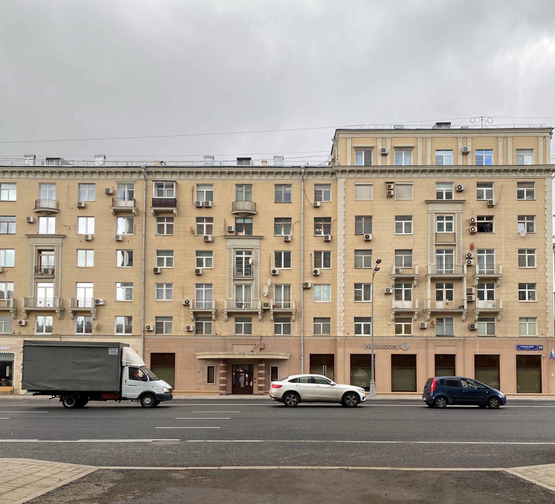 Дом 28 открывает собой ансамбль жилого комплекса, построенного в 1939-40 гг. на Ленинском проспекте, тогда — Большой Калужской улице. Он является как бы продолжением комплекса домов архитектора А.Е. Аркина, расположенных на площади Гагарина. Согласно Генеральному плану 1935 г., Большая Калужская улица должна была превратиться в новую прямую магистраль, соединяющую центр города и его окраину. В соответствии с этим планом каждый отрезок улицы, каждый квартал оформлялся «как целостный ансамбль», включенный в архитектурный комплекс столицы.