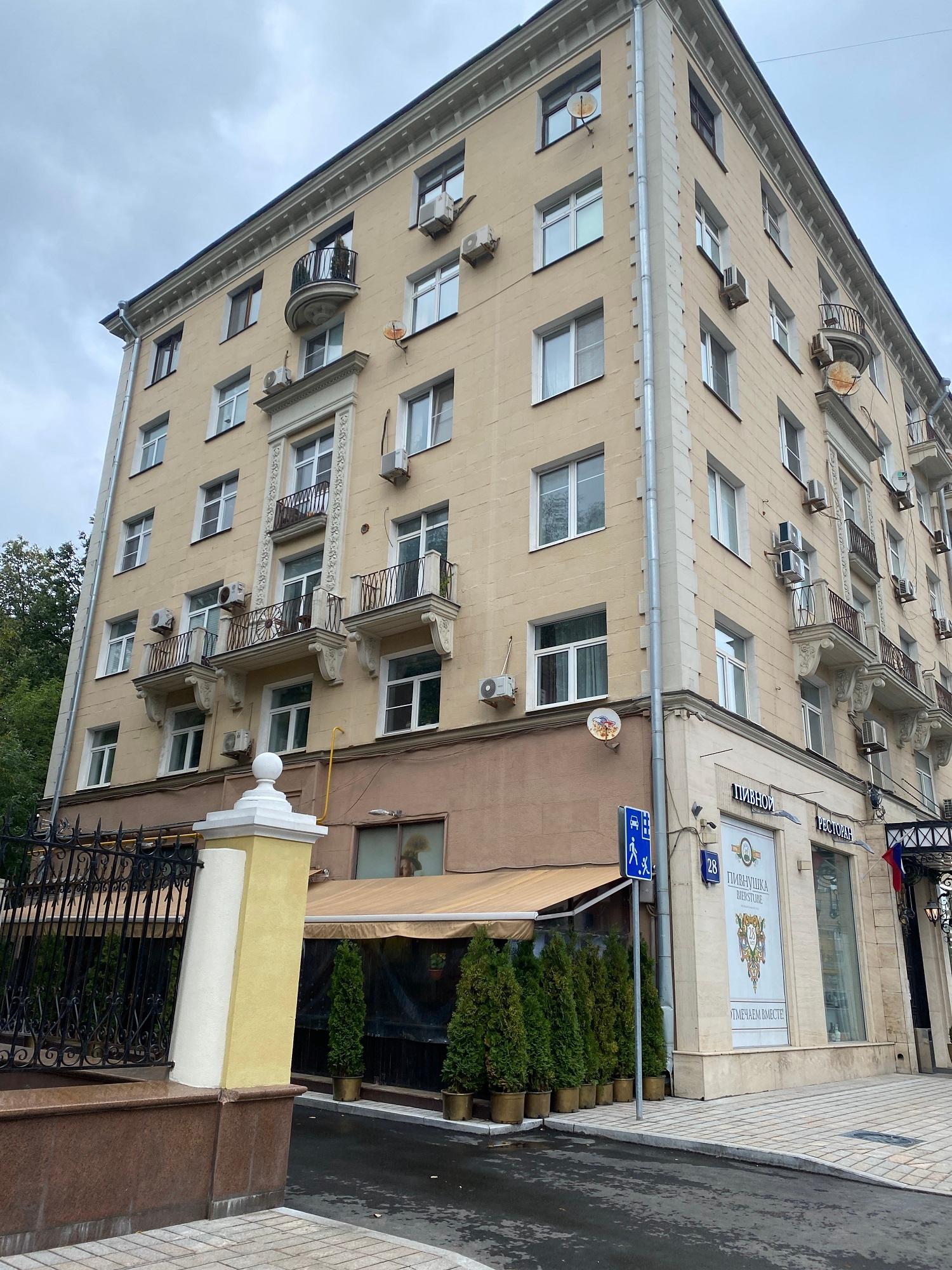Дом 28 — это точная копия дома 20, а также зеркальное отражение дома 24 по Ленинскому проспекту. Дома 28 и 24 образуют ансамбль с домом 26, стоящим далеко от красной линии, в глубине квартала. Вместе эти три дома представляют собой классическую композицию: главный дом, удаленный от красной линии, и два флигеля по бокам.