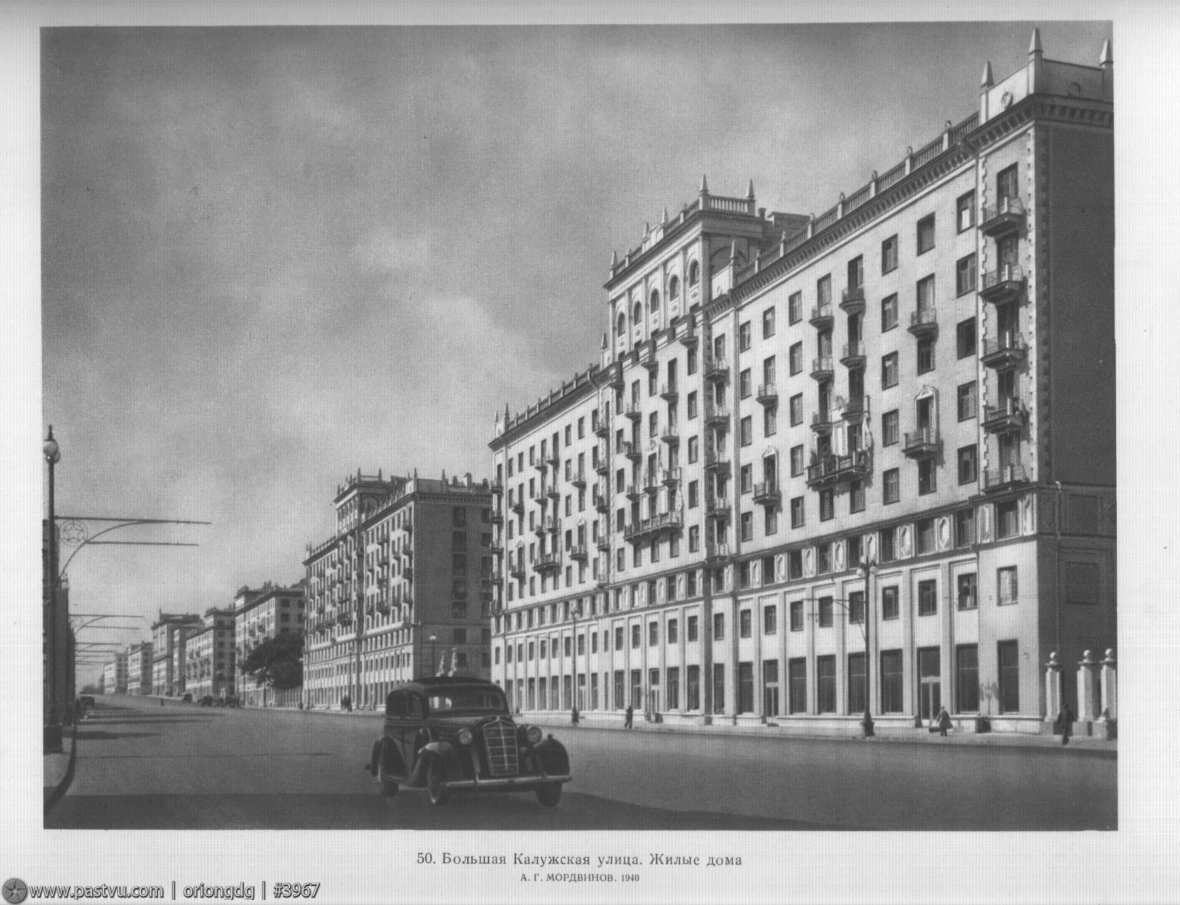 В 1940 году на Большой Калужской улице в рекордные сроки выросли одиннадцать домов, занявших четную и нечетную сторону проспекта. Четырнадцать месяцев понадобилось авторам проекта – архитекторам А. Г. Мордвинову, Д.Н. Чечулину и Г.П. Гольцу для возведения зданий новым поточным методом.