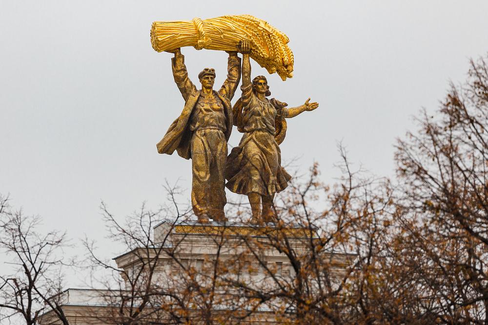 На вершине арки «Тракторист и колхозница» возносят на 32-метровую высоту аллегорический сноп колосьев — тяжелую промышленность и сельское хозяйство.