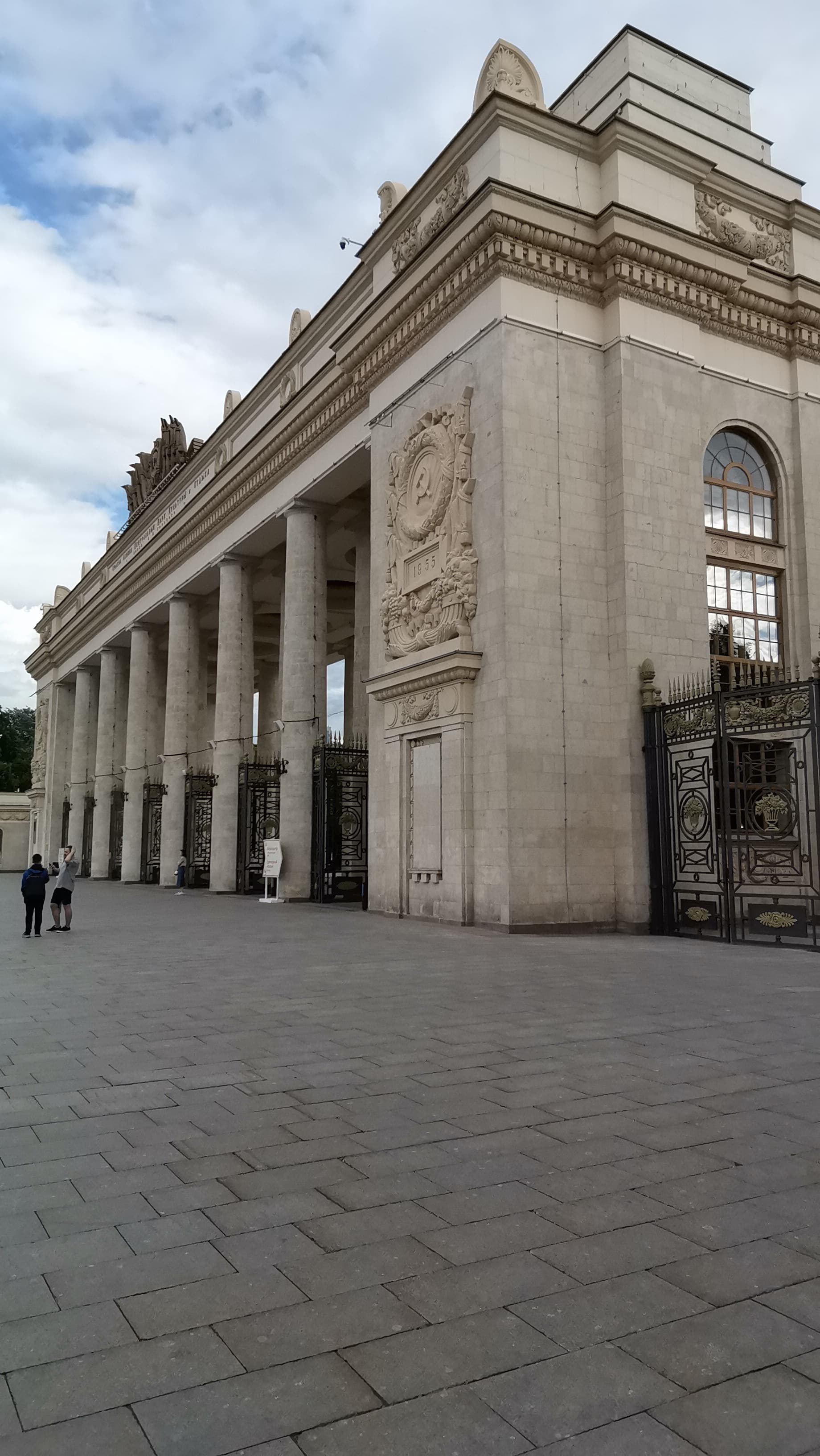 Входная группа Парка представляет собой монументальную арку высотой 29 метров с 24 колоннами и полукруглыми циркумференциями (архитекторы Георгий Щуко и Ассен Спасов, 1955 год). Вход в парк, построенный в 1929 году, был выполнен из дерева находился вплотную у Крымского вала. В его внутренних помещениях в 1930-е гг. проходили выставки, посвященные выполнению пятилетних планов, ударникам труда, индустриализации и красной армии. За входом простиралась Ленинская площадь. В.И. Ленин 19 октября 1923 года посетил ВСХВ и осмотрел павильон «Машиностроение». Это был последний приезд Владимира Ильича в Москву, в честь этого визита площадь за входом назвали Ленинской, о чем свидетельствует мемориальная доска на левом пилоне входа.