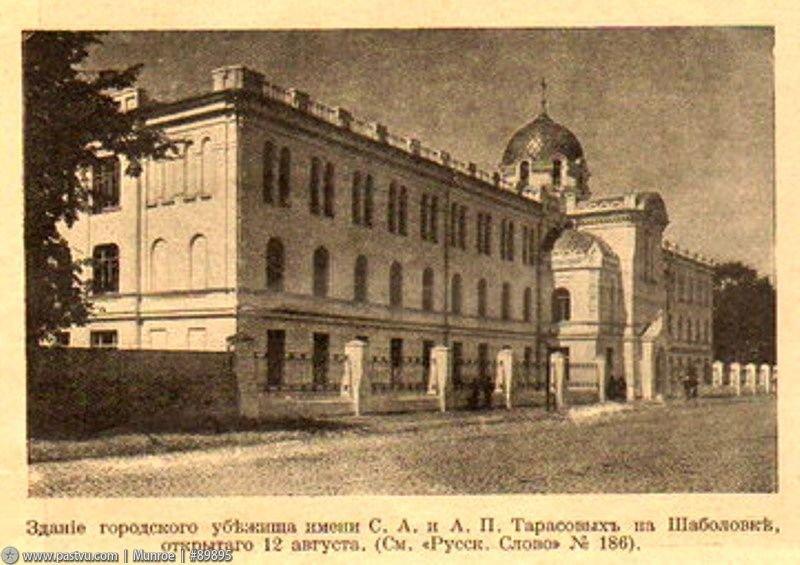 Семейство Тарасовых было известно в Москве середины ХIХ века: в 1865 году служивший в канцелярии московского обер-полицмейстера Степан Алексеевич получил потомственное дворянство, позднее он дошёл до чина действительного статского советника, несколько раз избирался городским гласным и почётным мировым судьей, а 1885 году был московским городским головой. Его вдова завещала 900 000 рублей на создание благотворительного учреждения – после её смерти в 1911–1912 годах на Шаболовке было возведено Городское убежище имени С.А. и А.П. Тарасовых. Архитектором выступил Александр Иванович Рооп, к тому времени известный строительством комплекса Сокольнической больницы и Газового завода в Нижнем Сусальном переулке.
