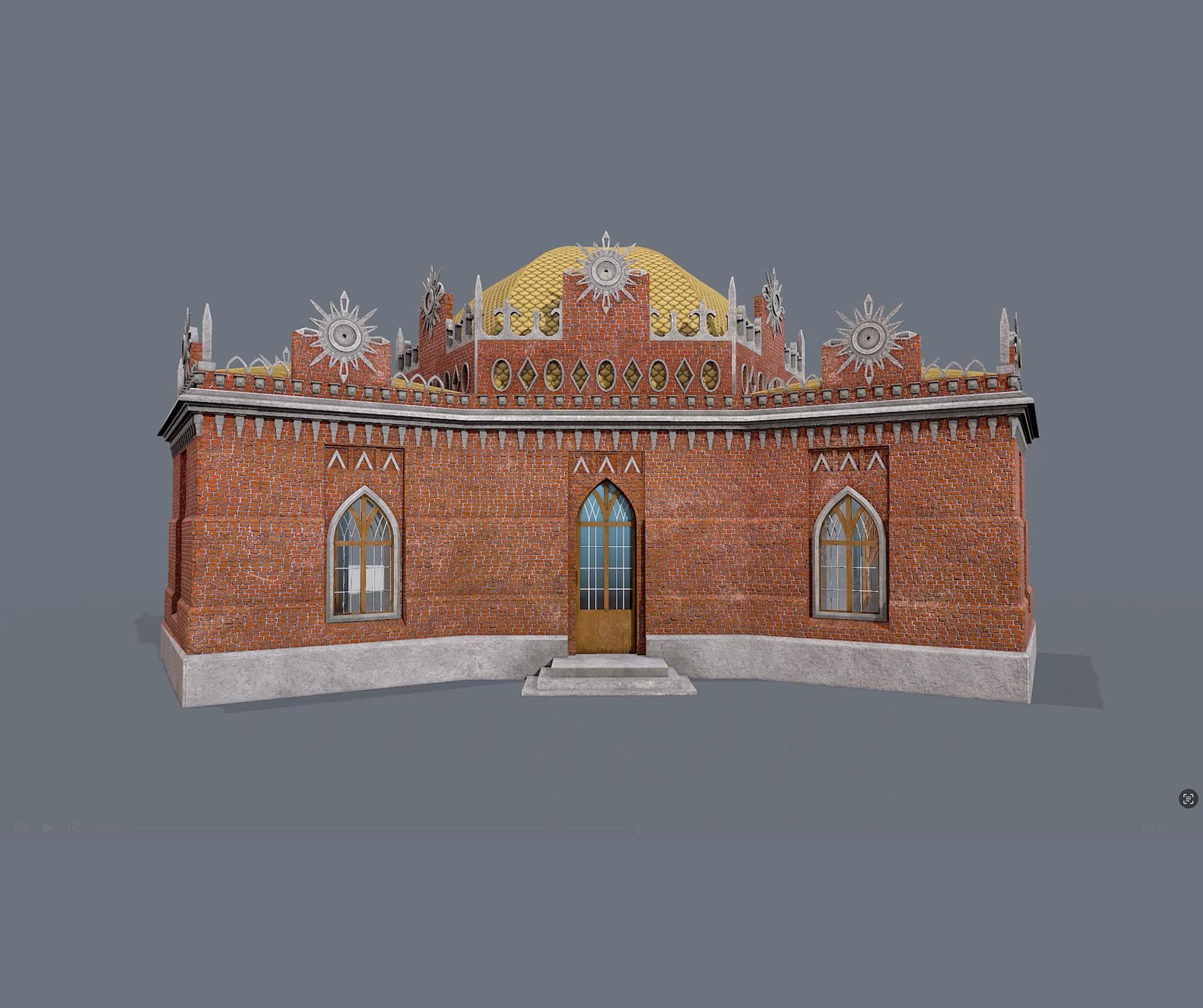 Одновременно шестиугольный домик соединялся в ансамбль с соседним крестообразным домиком. Вместе они были самыми миниатюрными корпуса дворцового ансамбля в Царицыне и предназначались для отдыха во время прогулки. Планировка шестиугольного корпуса заставляет предположить, что в нем мог быть расположен буфет.